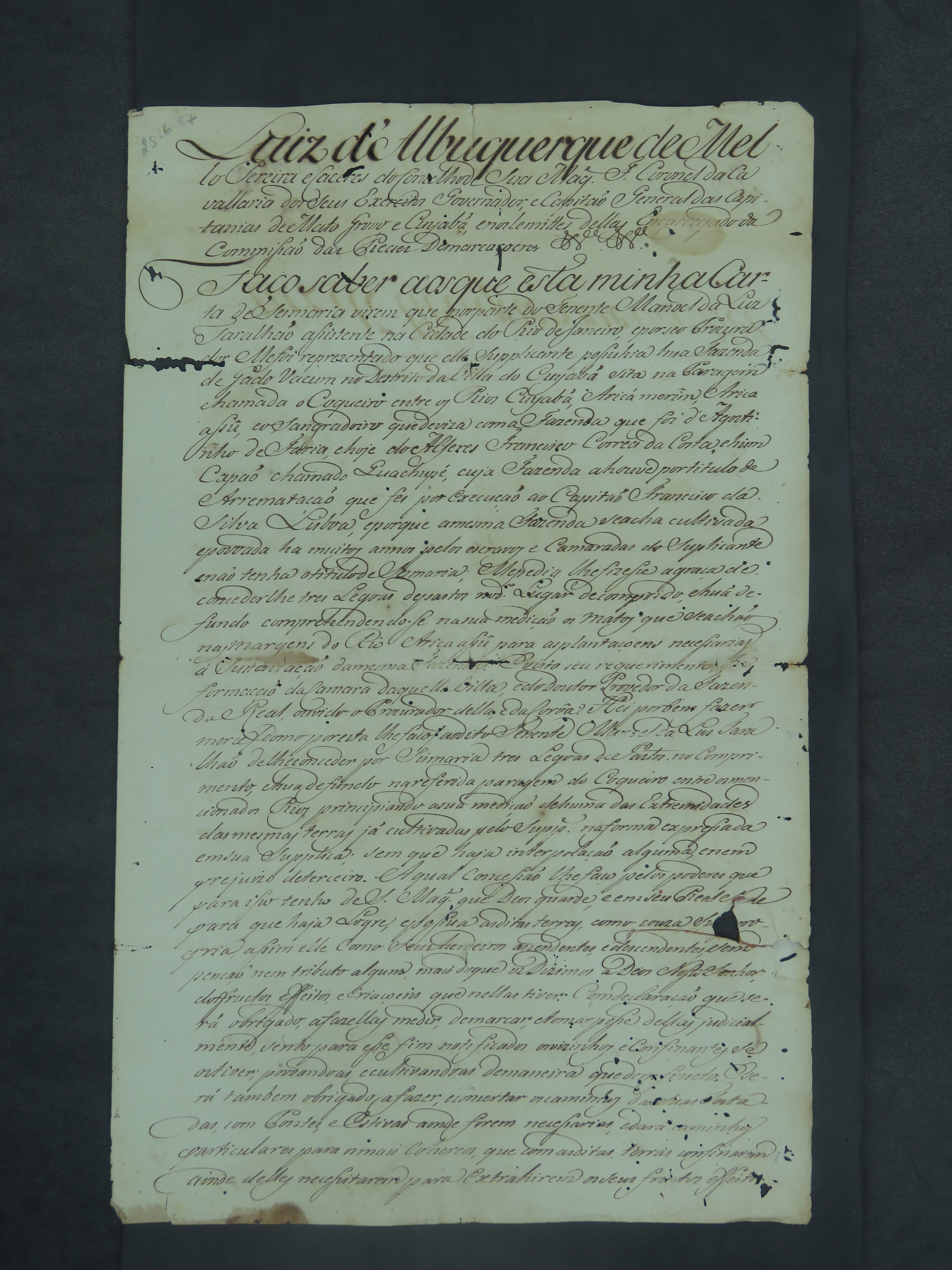 CARTA de Sesmaria concedida pelo Governador e Capitão-General da Capitania de Mato Grosso Luiz de Albuquerque de Melo Pereira e Cáceres para o Tenente Manoel da Luz [Taralhao].