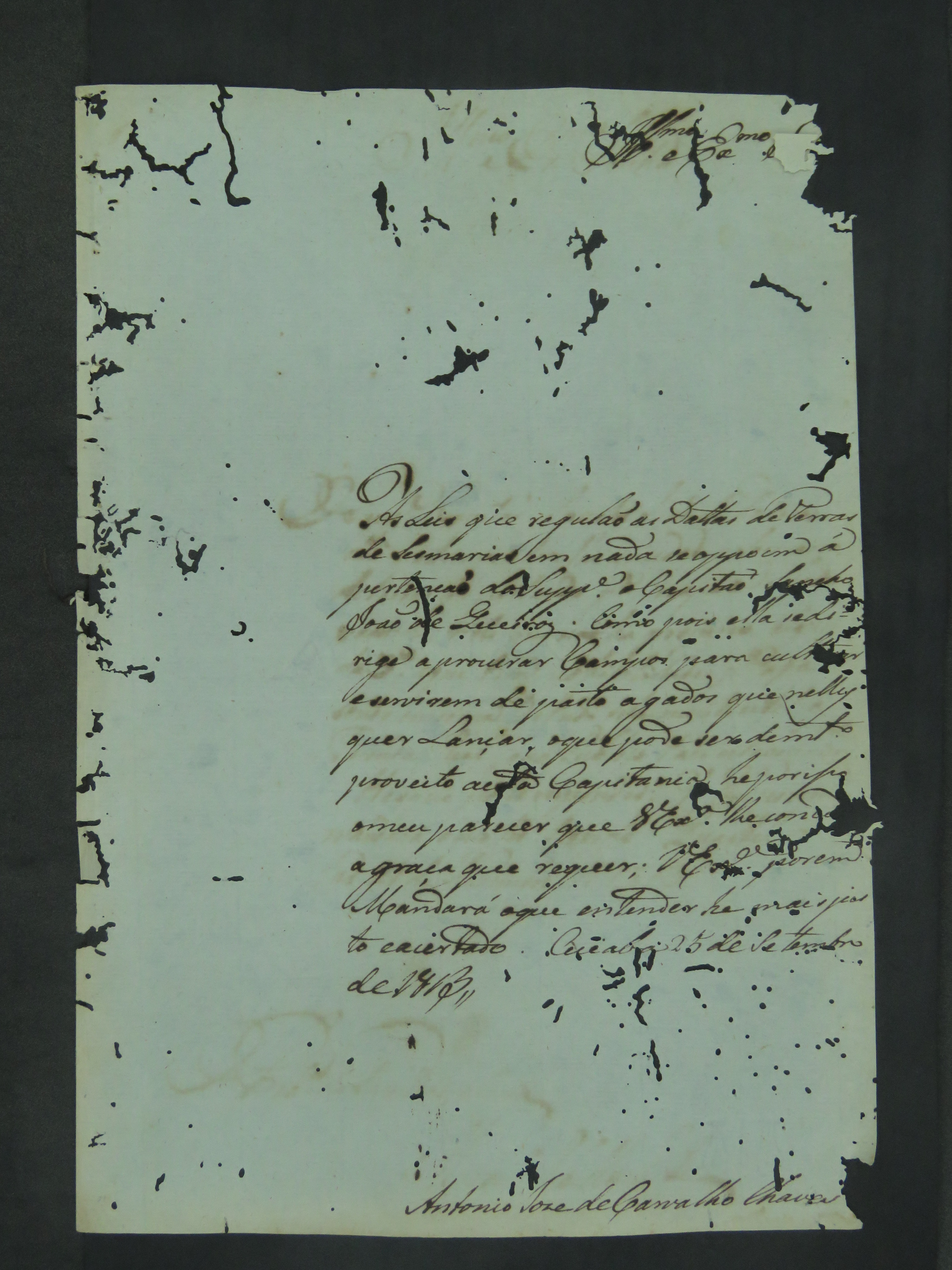 REQUERIMENTO do Capitão Sancho João de Queiróz para o Governador e Capitão-General da Capitania de Mato Grosso João Carlos Augusto de Oeynhausen e Gravemberg.