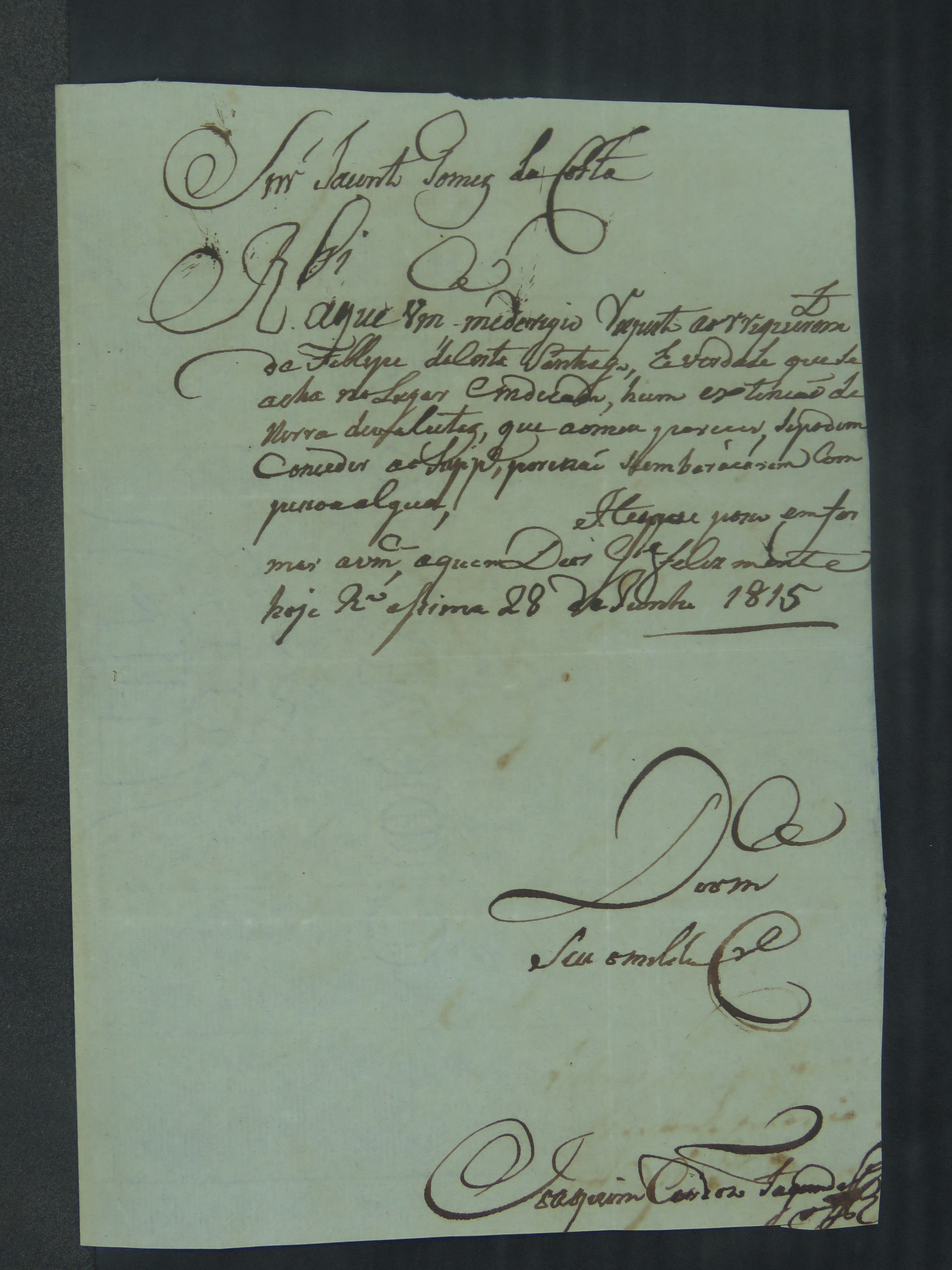REQUERIMENTO de Felipe da Costa Santiago ao Governador e Capitão-General da Capitania de Mato Grosso João Carlos Augusto D'Oeynhausen e Gravemberg.