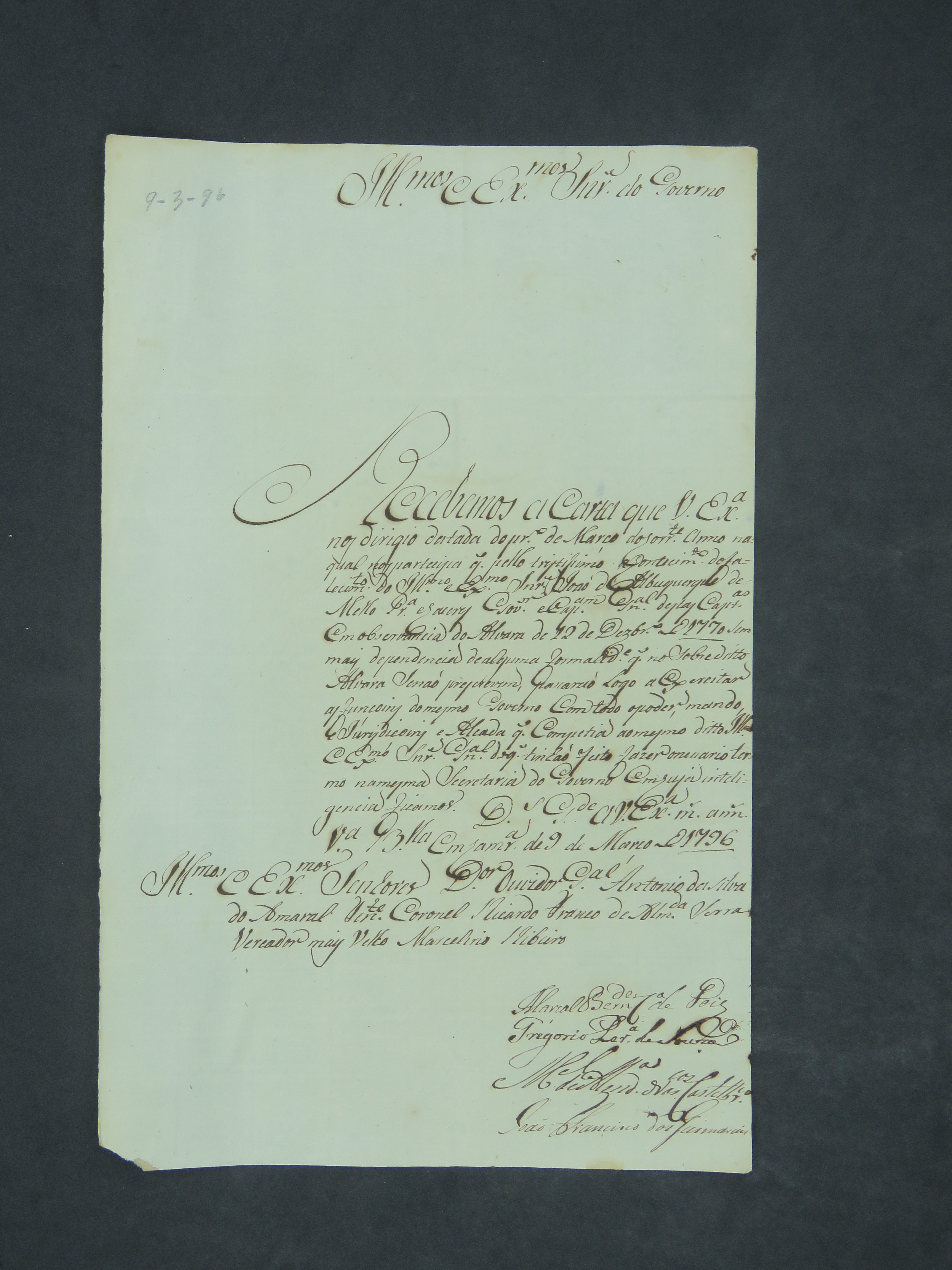 CARTA dos Vereadores da Câmara de Vila Bela da Santíssima Trindade aos Senhores Ouvidor Geral Antônio da Silva do Amaral, Tenente Coronel Ricardo Franco de Almeida Serra e o Vereador mais velho, Marcelino Ribeirão, acusando o recebimento da notícia da morte do Governador e Capitão-General da Capitania, João de Albuquerque, bem como sobre as funções a serem exercidas pela Junta de Governo Provisório.