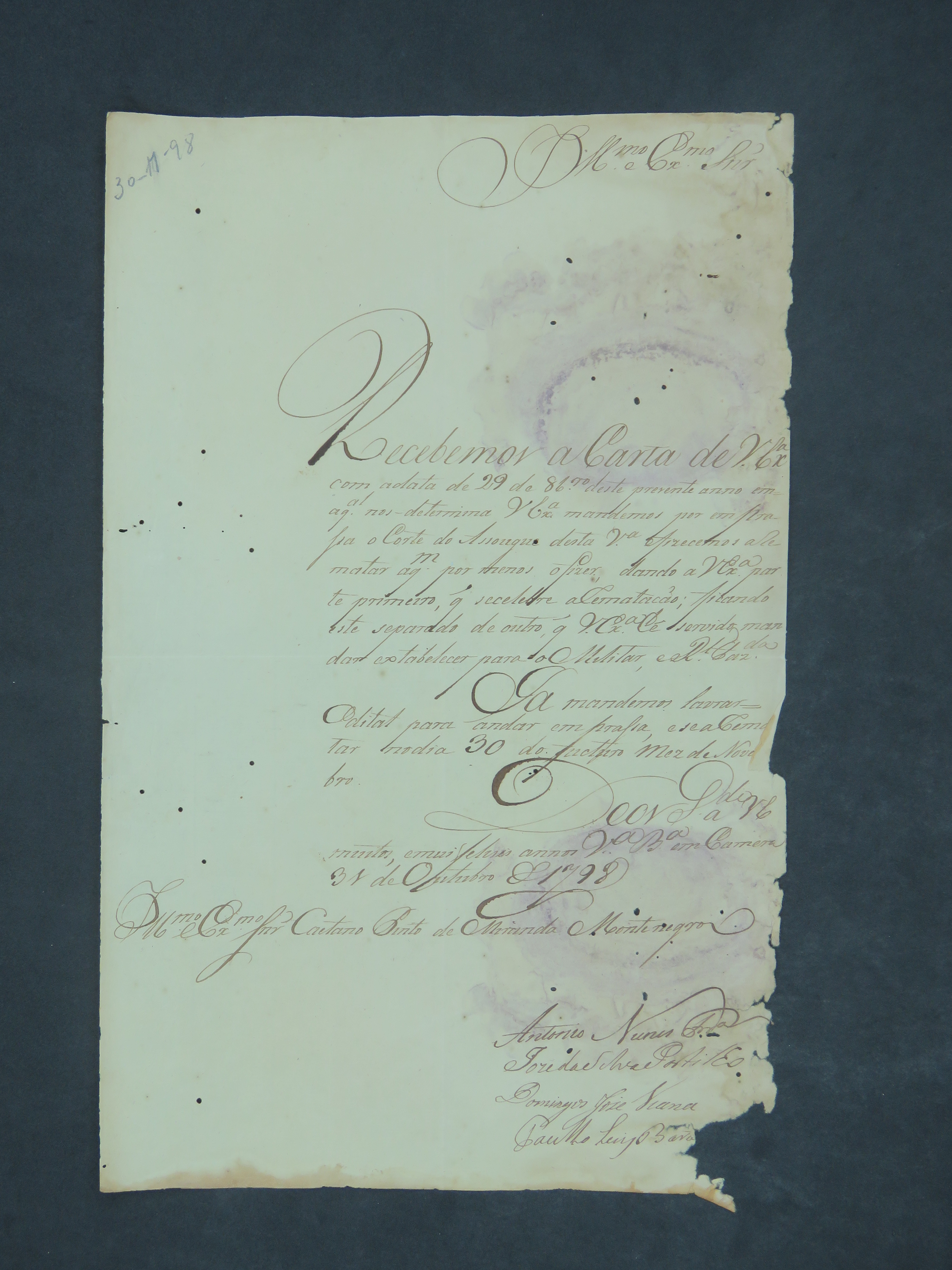 CARTA dos Vereadores da Câmara de Vila Bela da Santíssima Trindade ao Governador e Capitão General da Capitania de Mato Grosso Luis Pinto de Souza Coutinho, acusando o recebimento de aviso direcionados aos mesmos.
