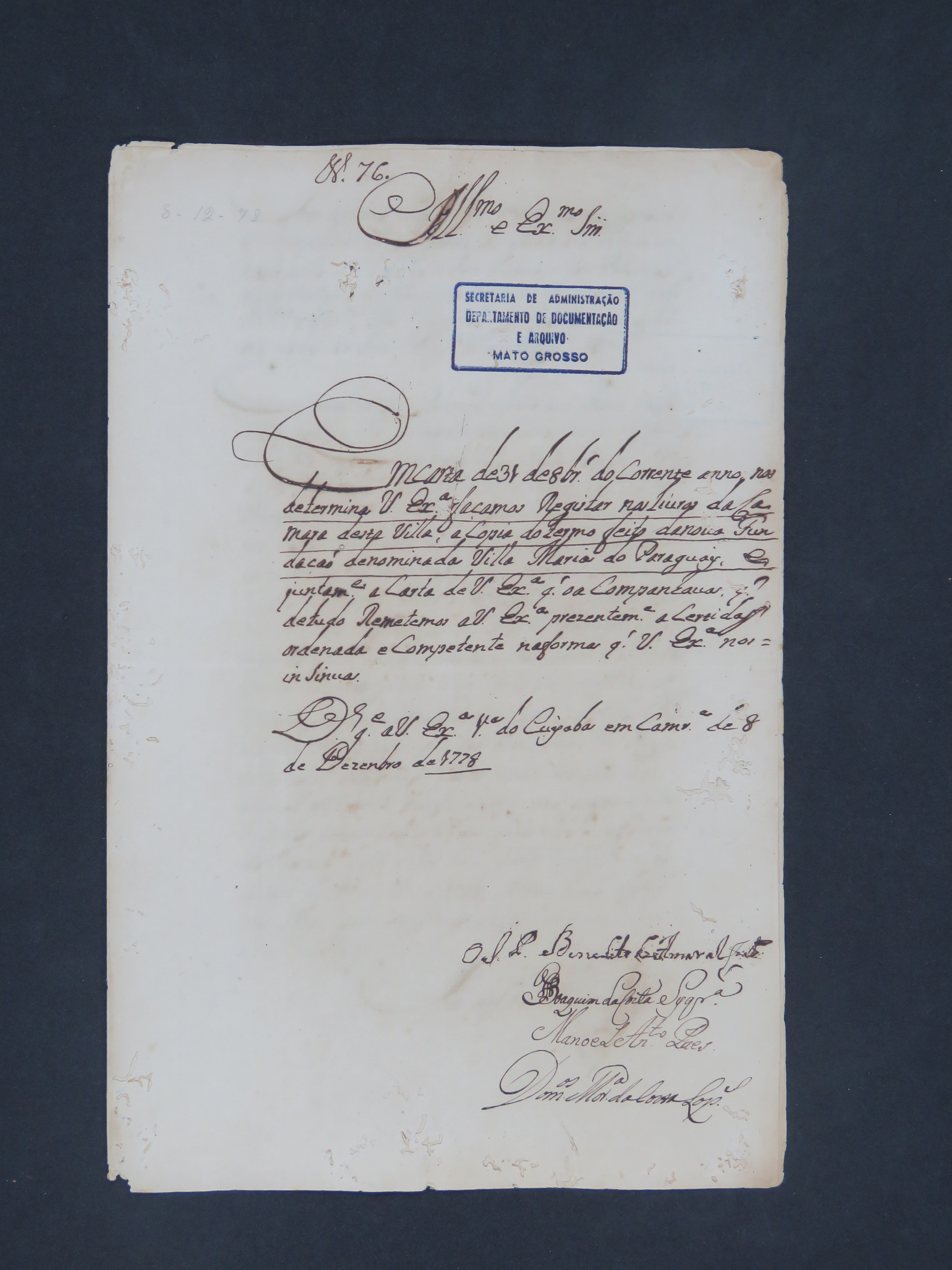 CARTA dos Vereadores da Câmara da Vila do Cuiabá ao Governador e Capitão-General da Capitania de Mato Grosso, Luís de Albuquerque de Melo Pereira e Cáceres, versando sobre a determinação do governador para que se registre no livro da Câmara a cópia do termo da fundação de Vila Maria do Paraguai.