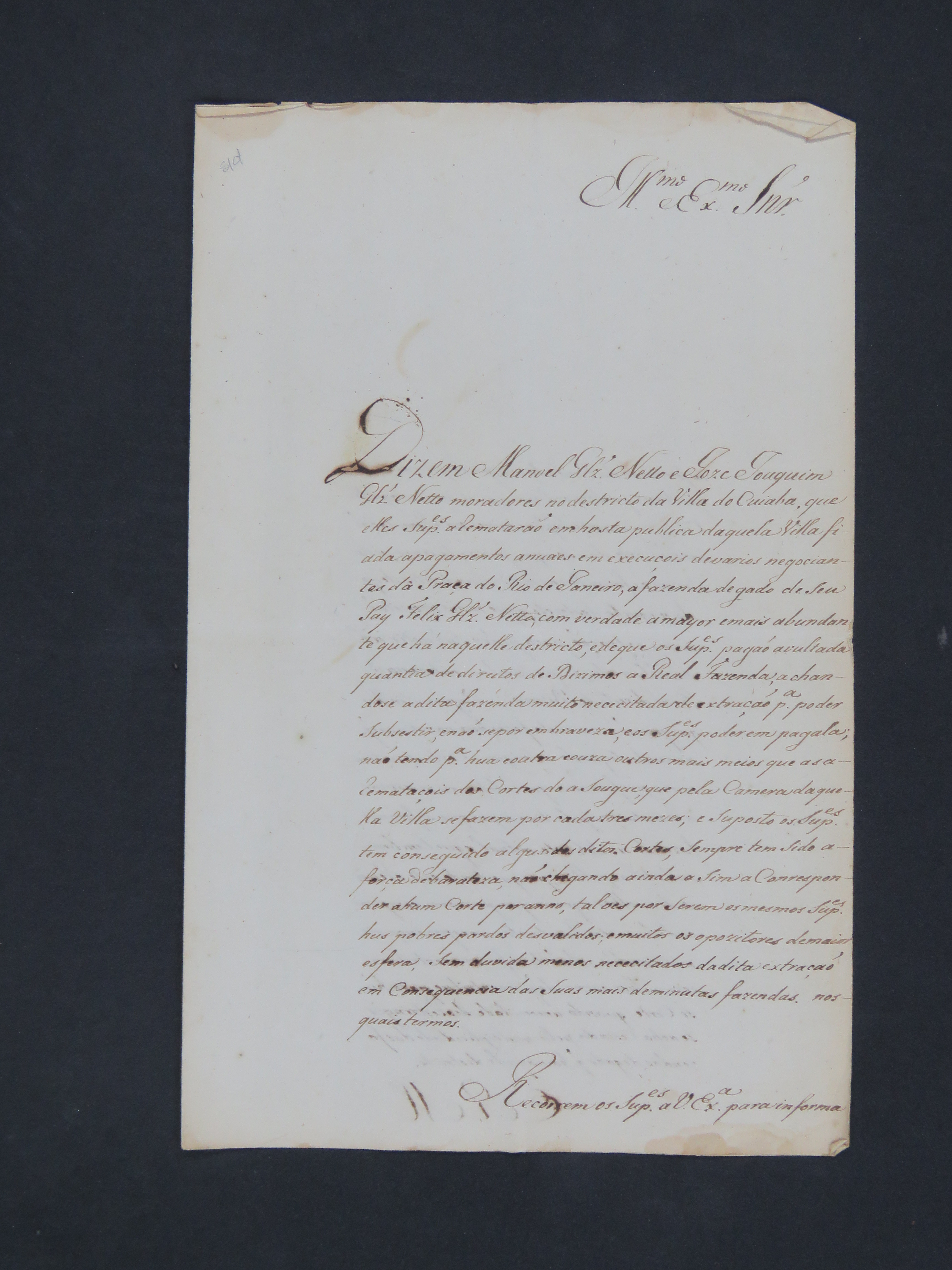 CARTA dos Vereadores da Câmara da Vila do Cuiabá ao Governador e Capitão-General da Capitania de Mato Grosso, João de Albuquerque de Melo Pereira e Cáceres, encaminhando o auto da Junta formada para responder ao requerimento de Manoel Gonçalves Neto e de Joaquim José Gonçalves Neto, referente a carne vendida na vila.