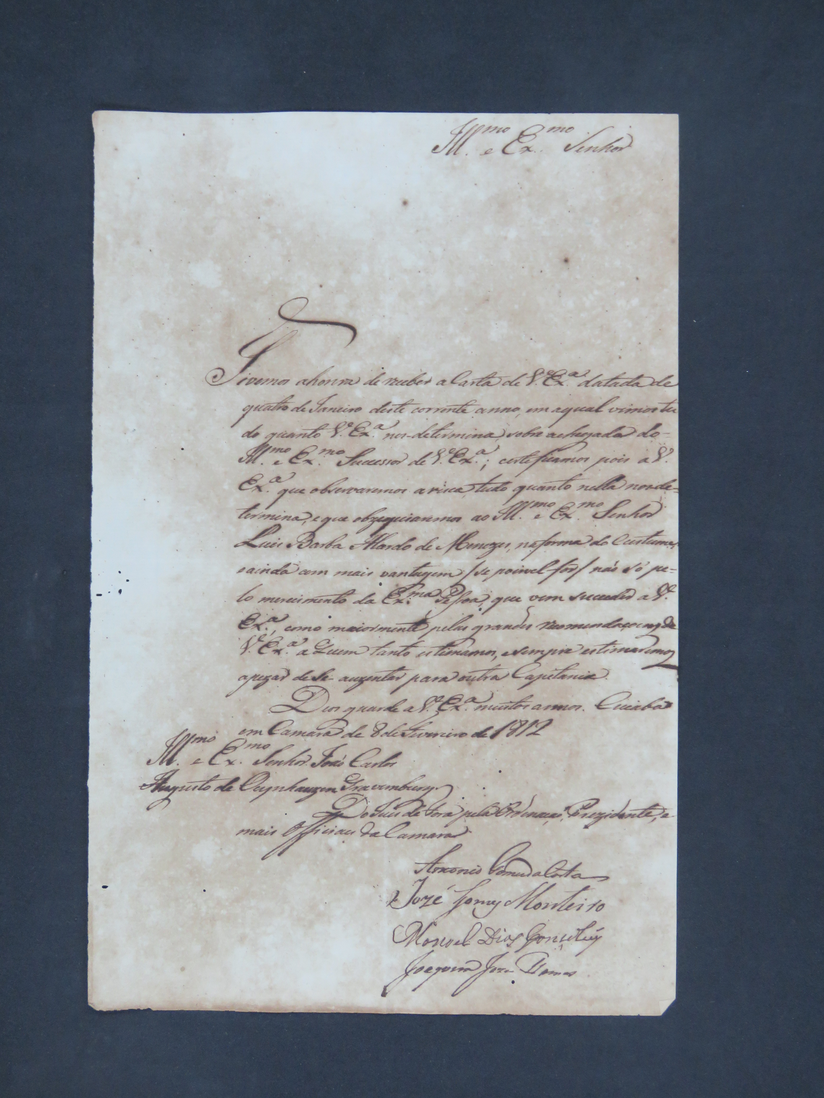 CARTA dos Vereadores da Câmara ao Governador e Capitão-General da Capitania de Mato Grosso, João Carlos Augusto D'Oeynhausen e Gravemberg, informando que obedeceram as ordens de bem receber o novo Governador e Capitão-General.