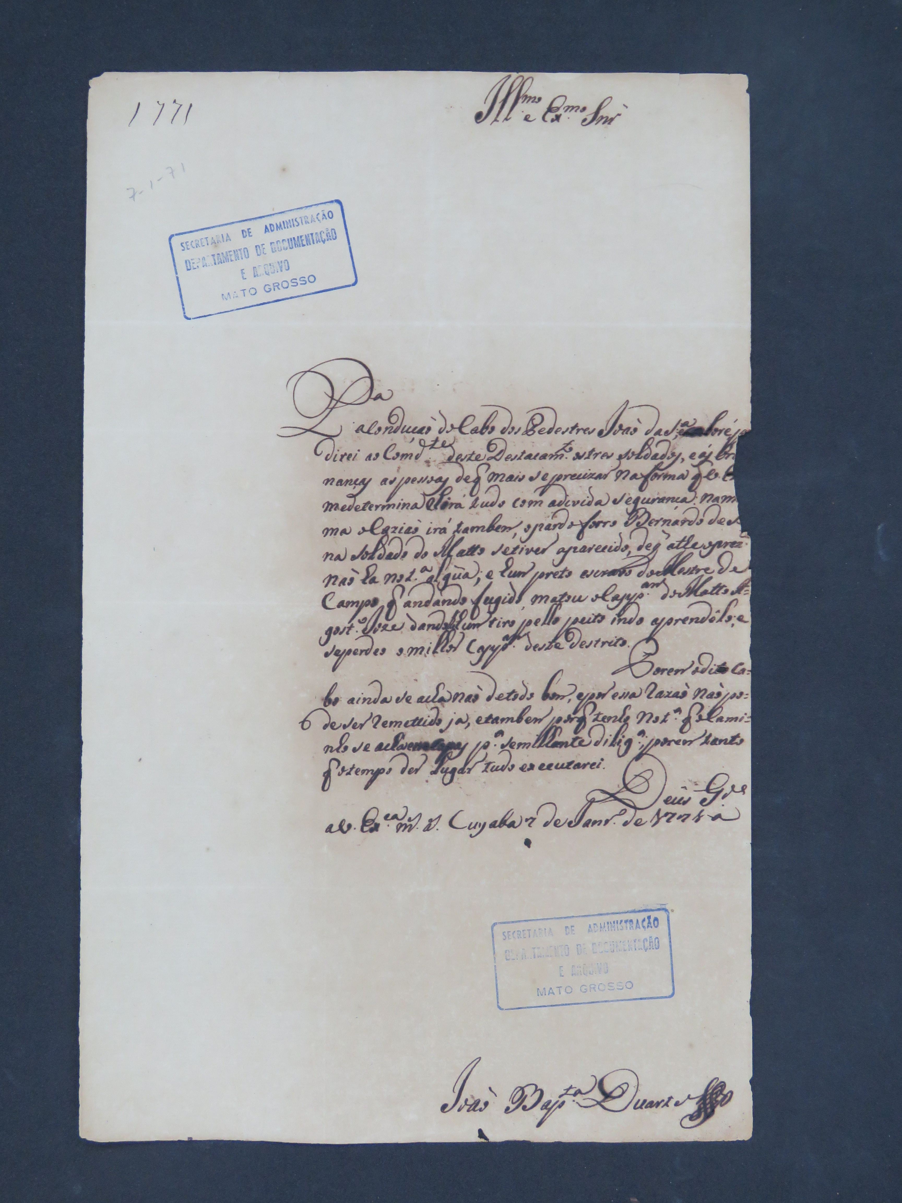 CARTA do Juiz de Fora da Vila do Cuiabá, João Baptista Duarte, ao [Governador e Capitão-General da Capitania de Mato Grosso, Luís Pinto de Souza Coutinho], informando que, por condução do cabo dos Pedestres, João da Silva, dará três soldados ao comandante deste destacamento, bem como as ordenanças necessárias às pessoas.