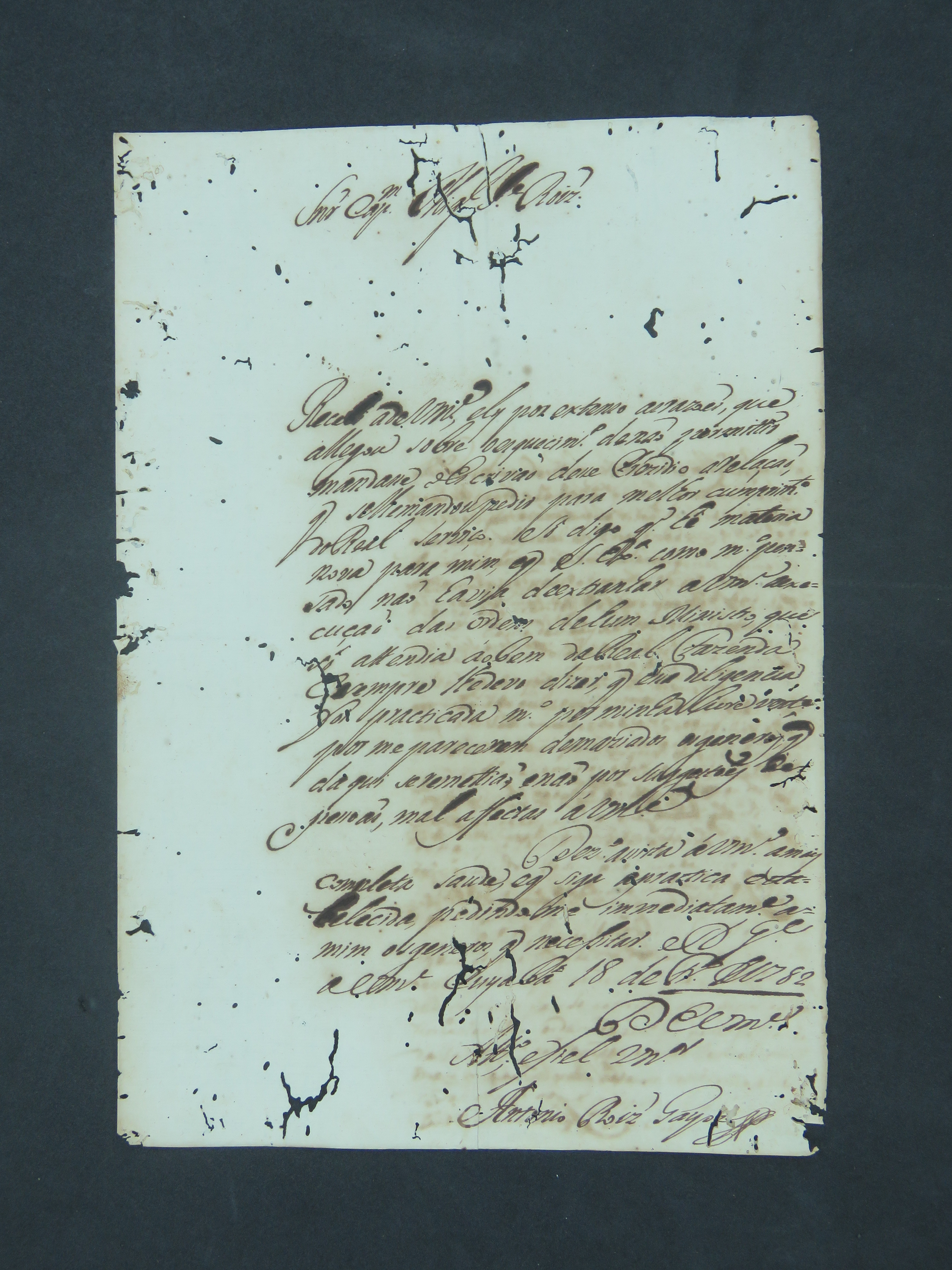 CARTA do Juiz de Fora da Vila do Cuiabá, Antônio Rodrigues Gaioso, ao Capitão Miguel [...] Rodrigues.