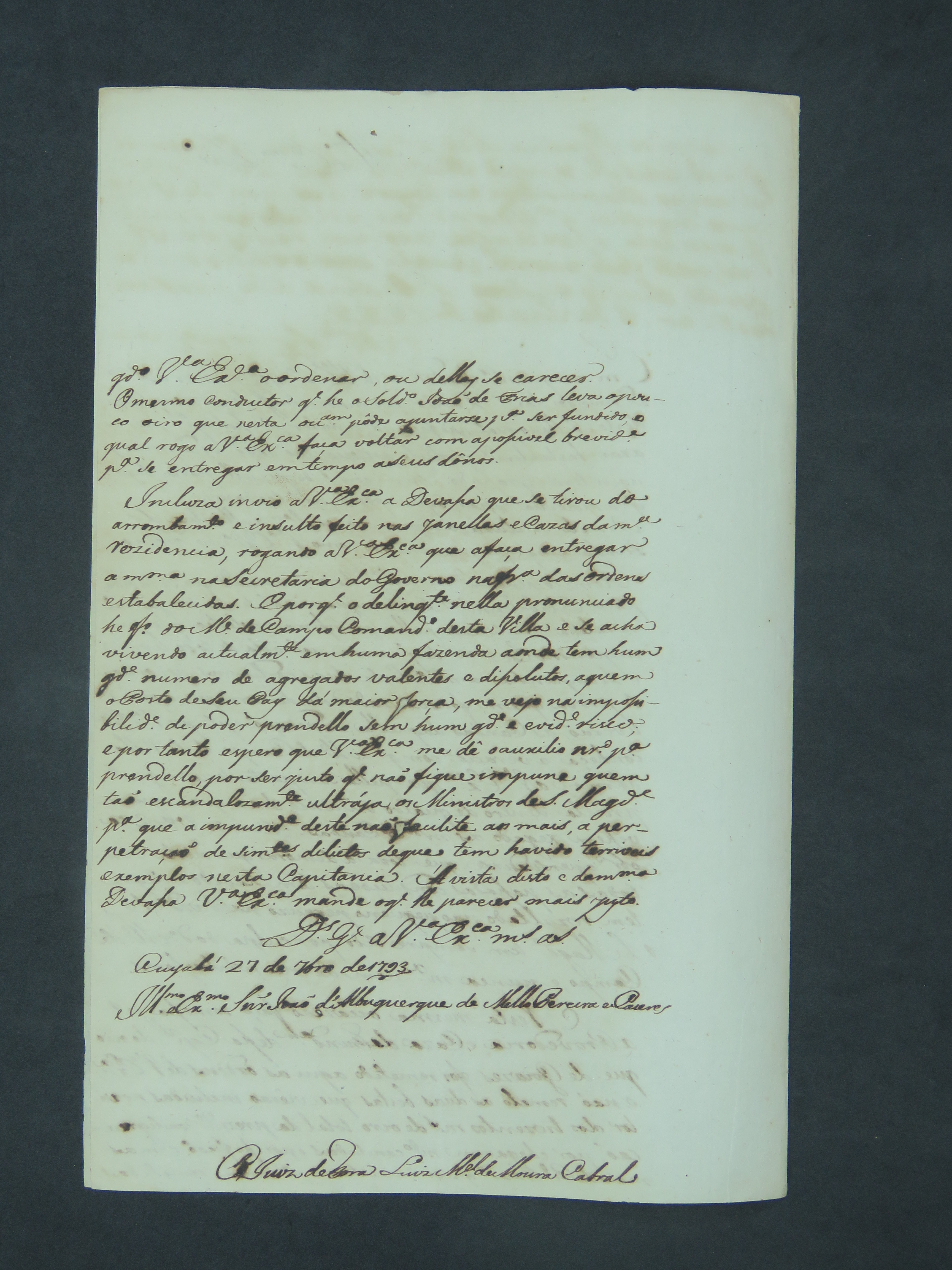 CARTA do Juiz de Fora da Vila do Cuiabá, Luís Manoel de Moura Cabral, ao Governador e Capitão-General da Capitania de Mato Grosso, João de Albuquerque de Melo Pereira e Cáceres.