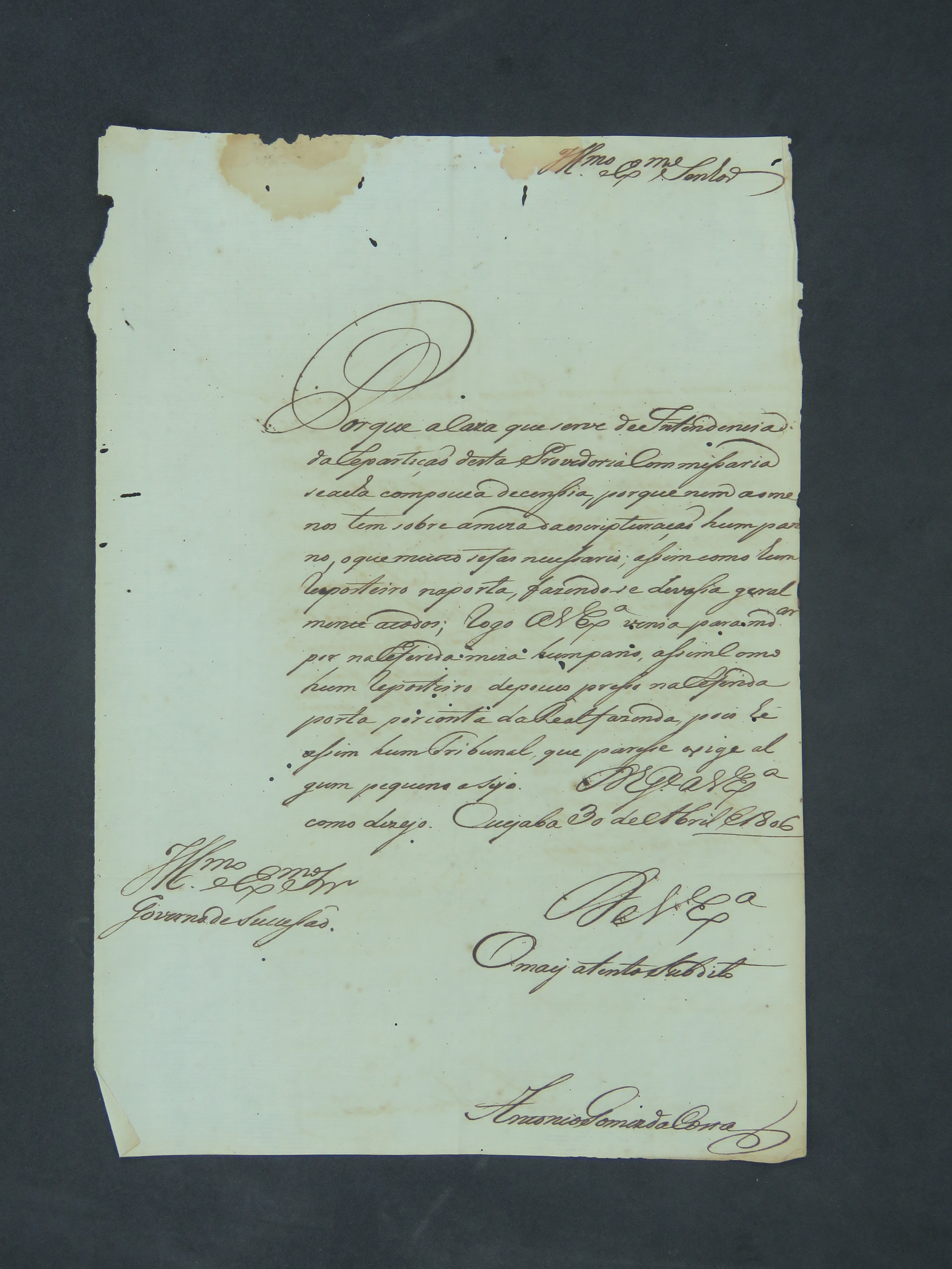 CARTA do Juiz de Fora por Ordenação, Antônio Gomes da Costa, a 3ª Junta Governativa da Capitania de Mato Grosso.