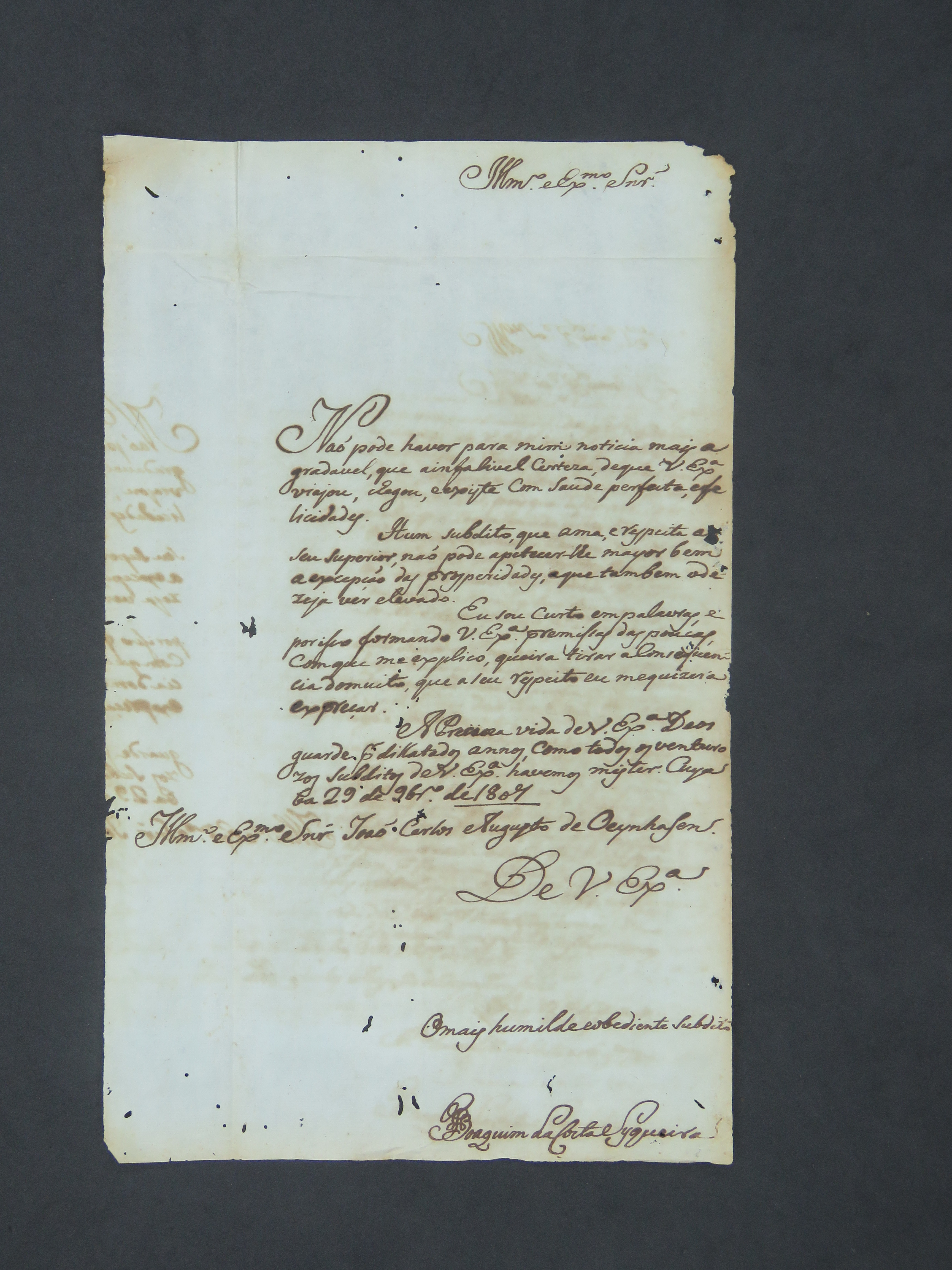 CARTA do Juiz de Fora por ordenação, Joaquim da Costa Siqueira, ao Governador e Capitão-General da Capitania de Mato Grosso, João Carlos Augusto D' Oeynhausen e Gravemberg.