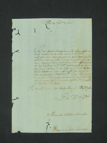 CARTA do Juiz de Fora por ordenação, Joaquim da Costa Siqueira, ao Governador e Capitão-General da Capitania de Mato Grosso, João Carlos Augusto D' Oeynhausen e Gravemberg.