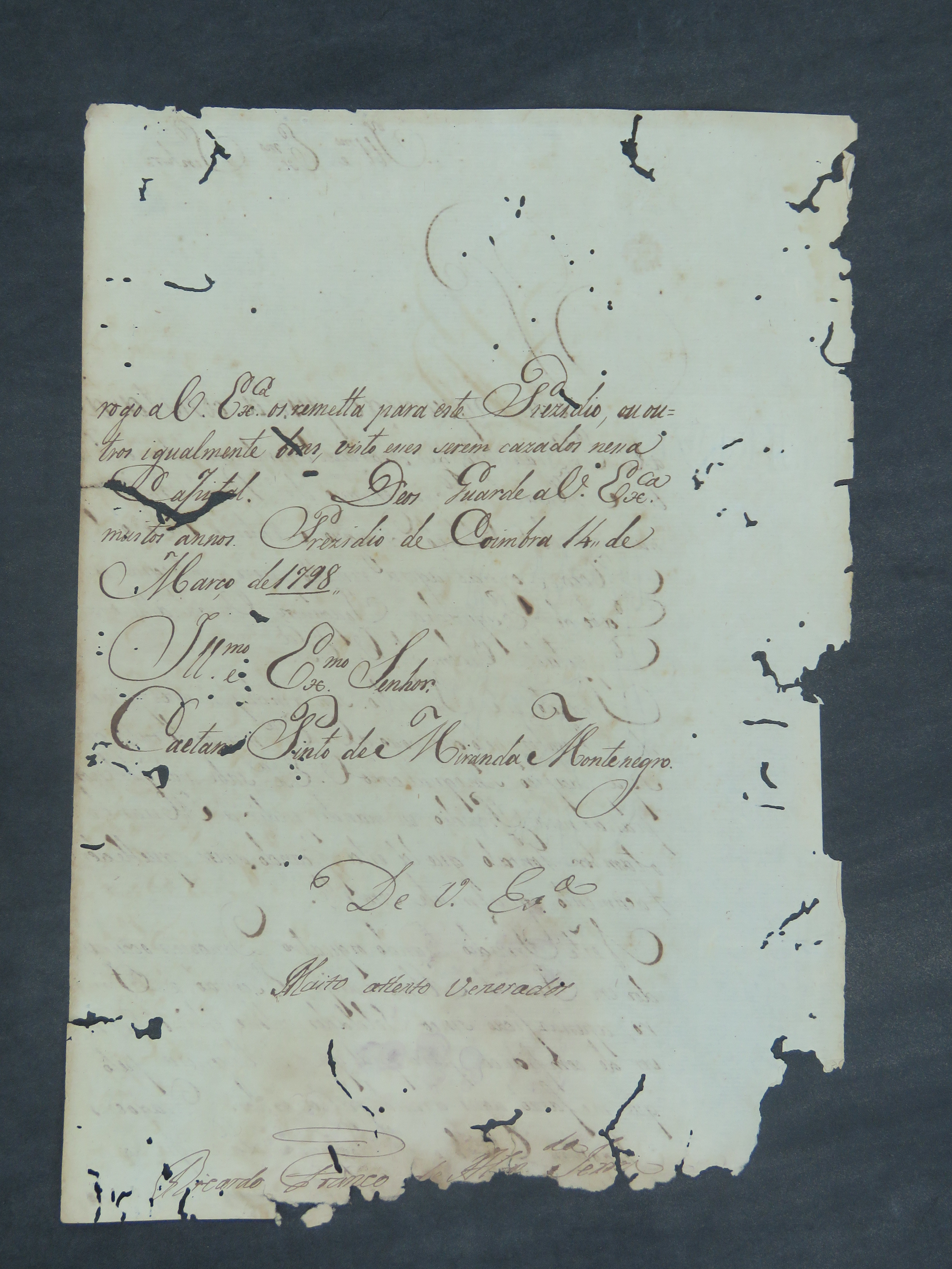 CARTA do Comandante do Forte de Coimbra Ricardo Franco de Almeida Serra ao Governador e Capitão General da Capitania de Mato Grosso Caetano Pinto de Miranda e Montenegro.