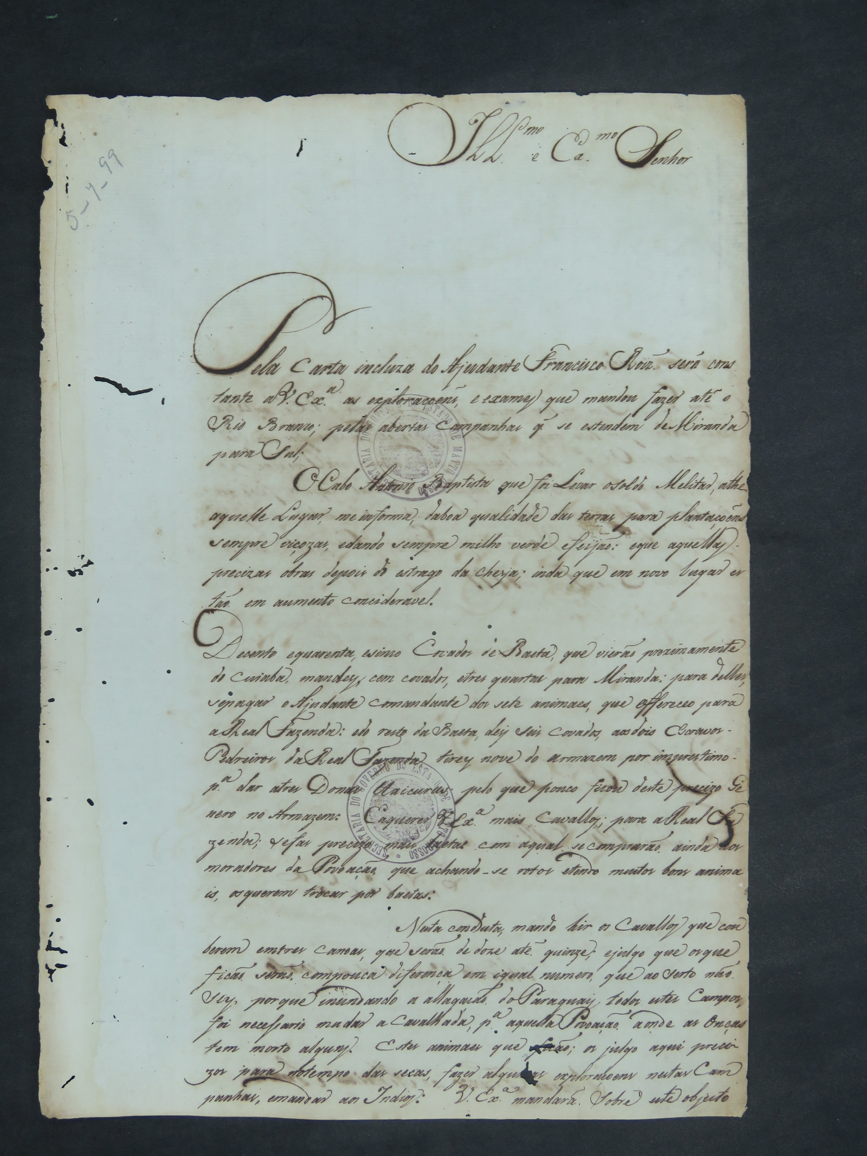 CARTA do Comandante do Presídio de Coimbra Ricardo Franco de Almeida Serra ao Governador e Capitão-General da Capitania de Mato Grosso Caetano Pinto de Miranda e Montenegro.