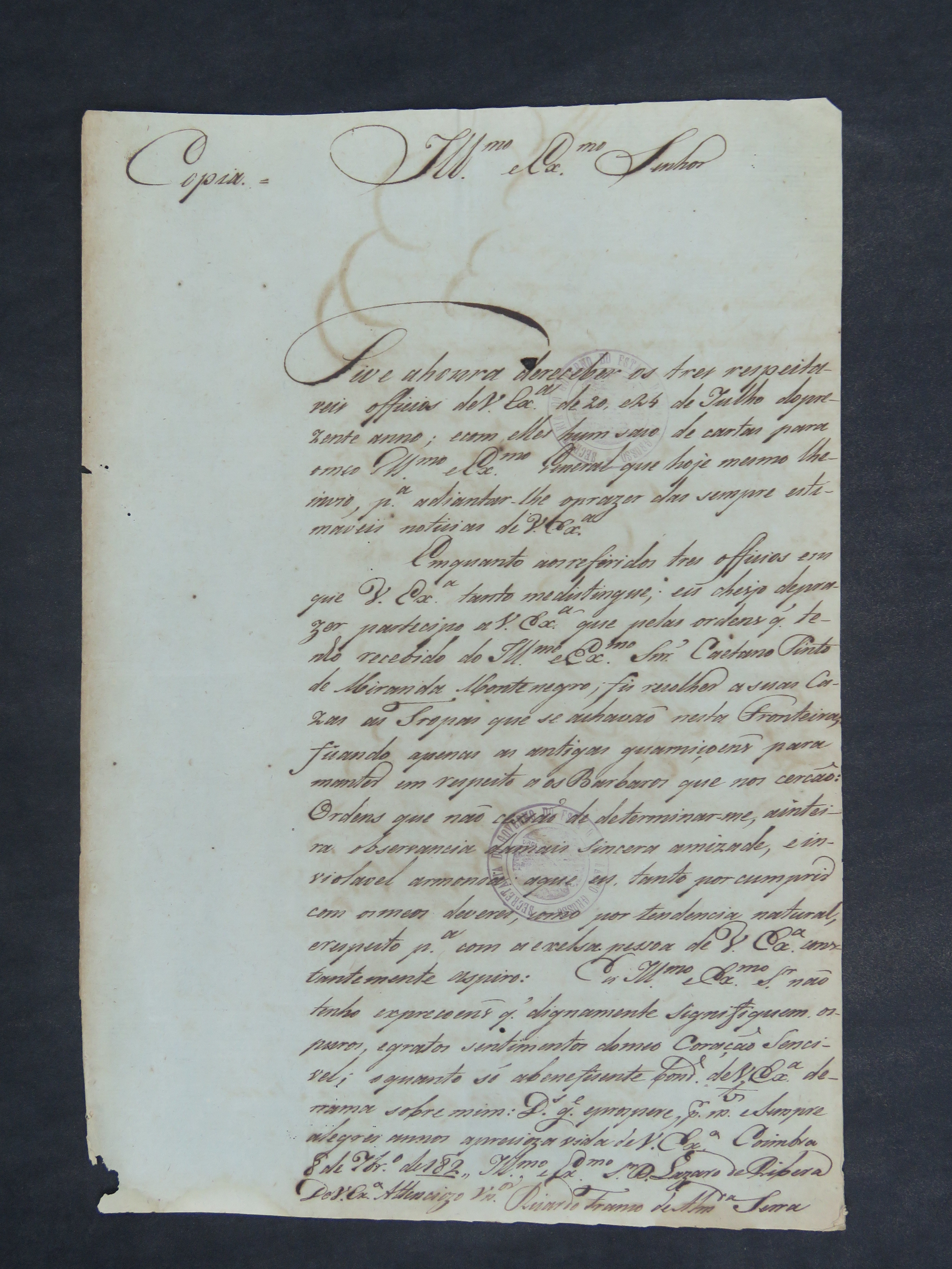 CARTA (cópia) do Tenente Coronel Comandante do Forte de Coimbra Ricardo Franco de Almeida Serra ao Governador de Assunção Dom Lázaro Ribera.