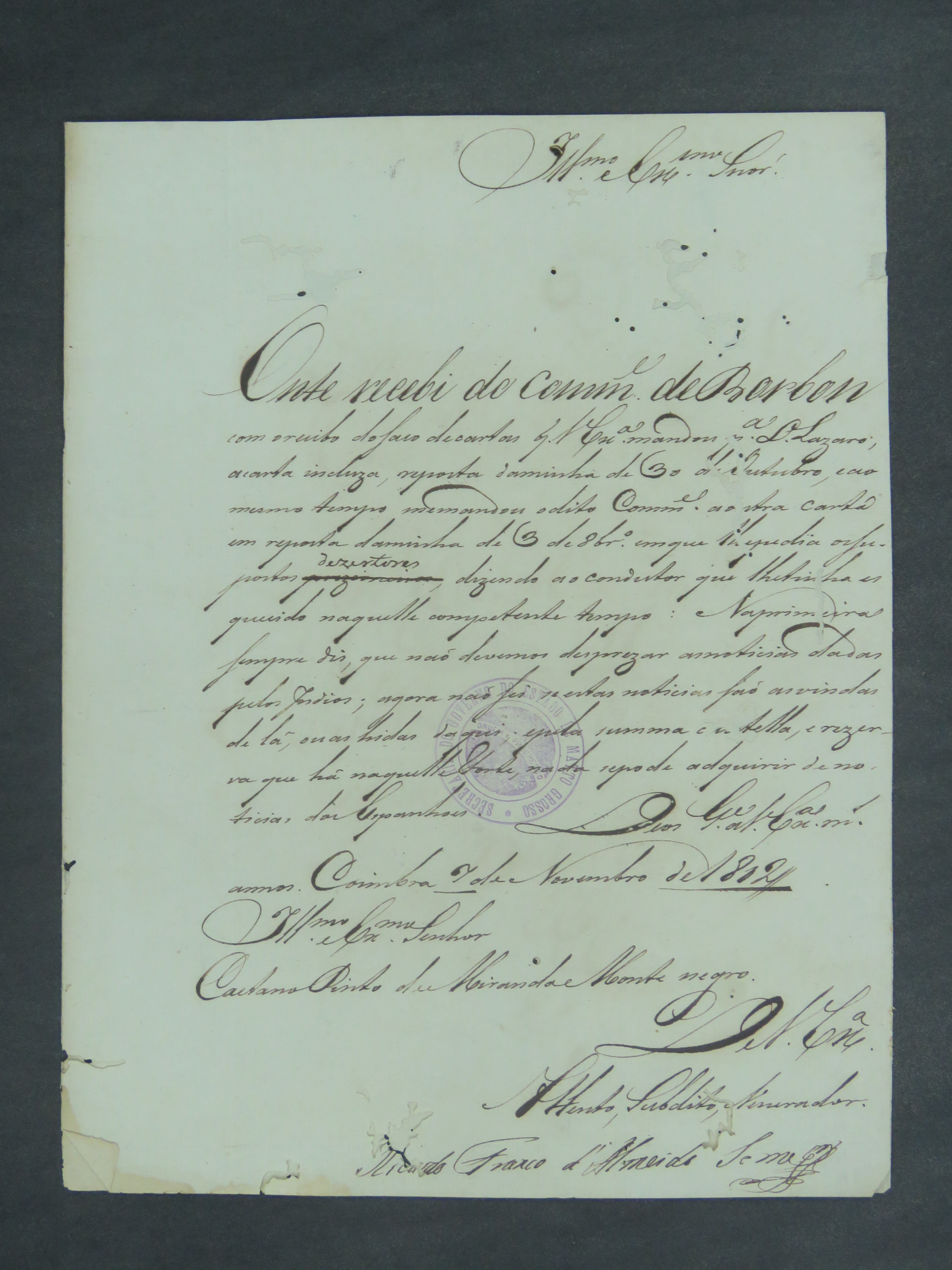 CARTA do Tenente Coronel Comandante de Coimbra Ricardo Franco de Almeida Serra ao Governador e Capitão General da Capitania de Mato Grosso Caetano Pinto de Miranda e Montenegro.
