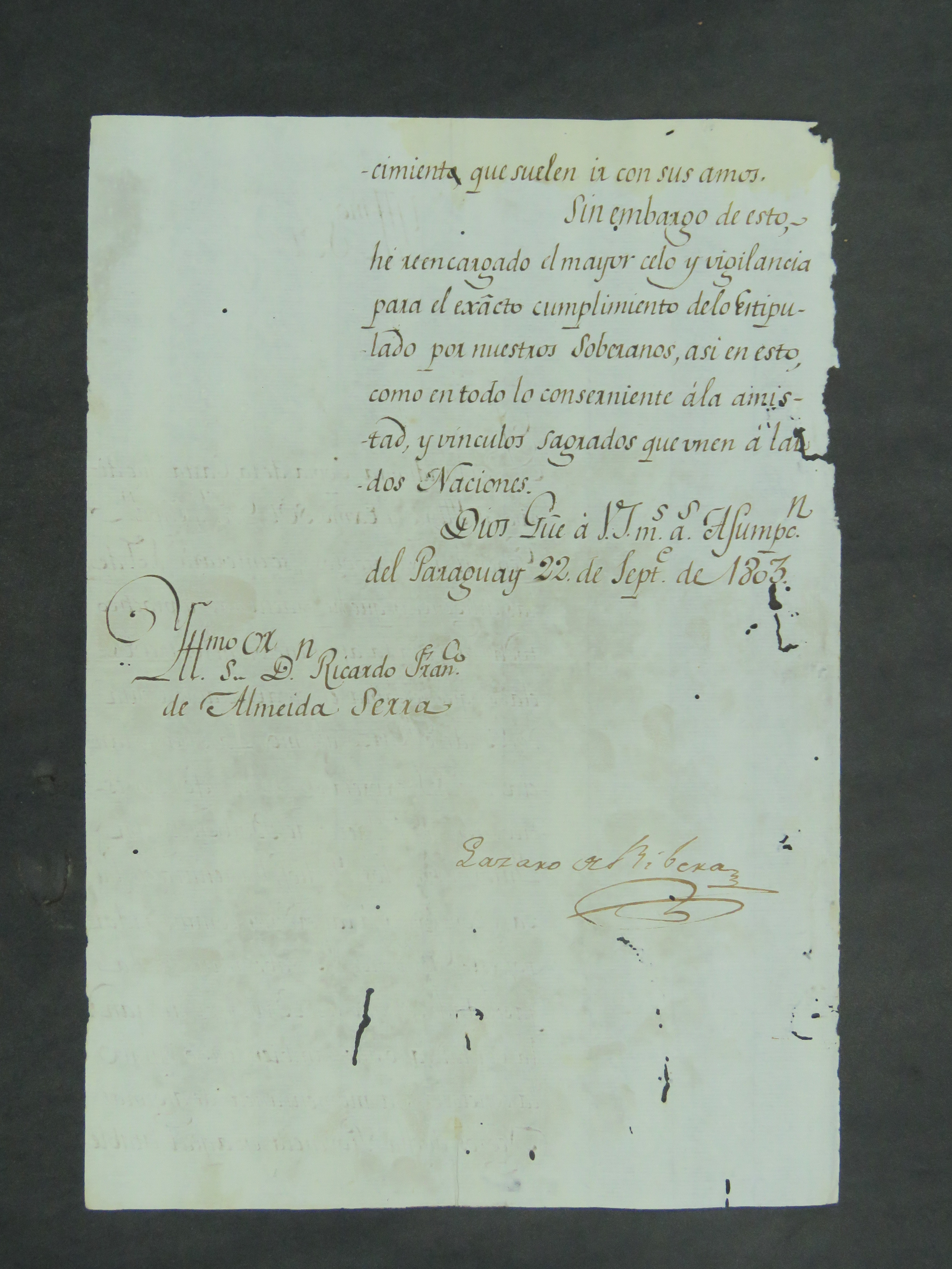 CARTA de Lázaro de Ribera ao Tenente Coronel Ricardo Franco de Almeida Serra.