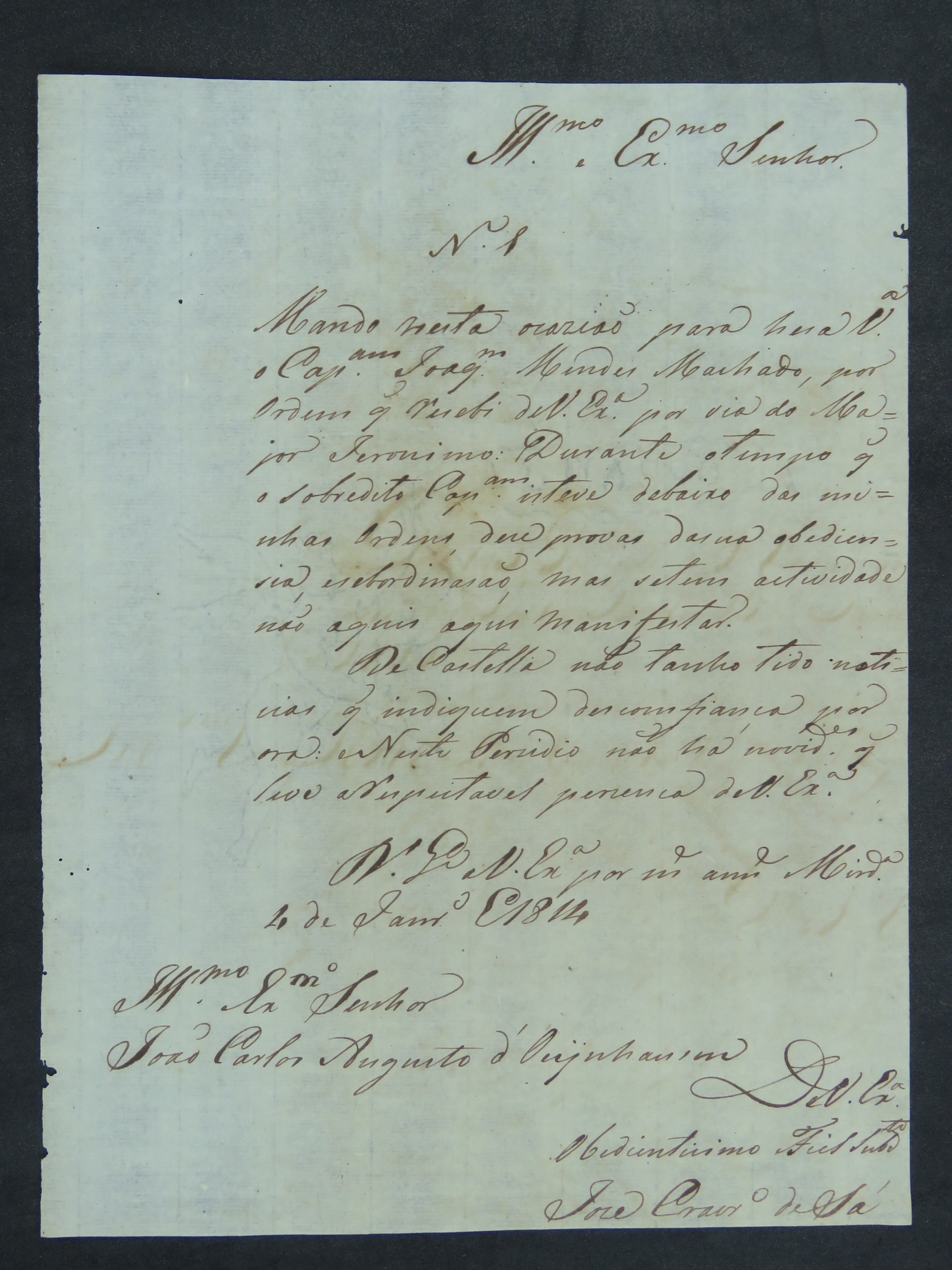 CARTA do [Comandante] do Presídio de Miranda José Craveiro de Sá ao Governador e Capitão-General da Capitania de Mato Grosso João Carlos Augusto D’ Oeynhausen e Gravemberg.