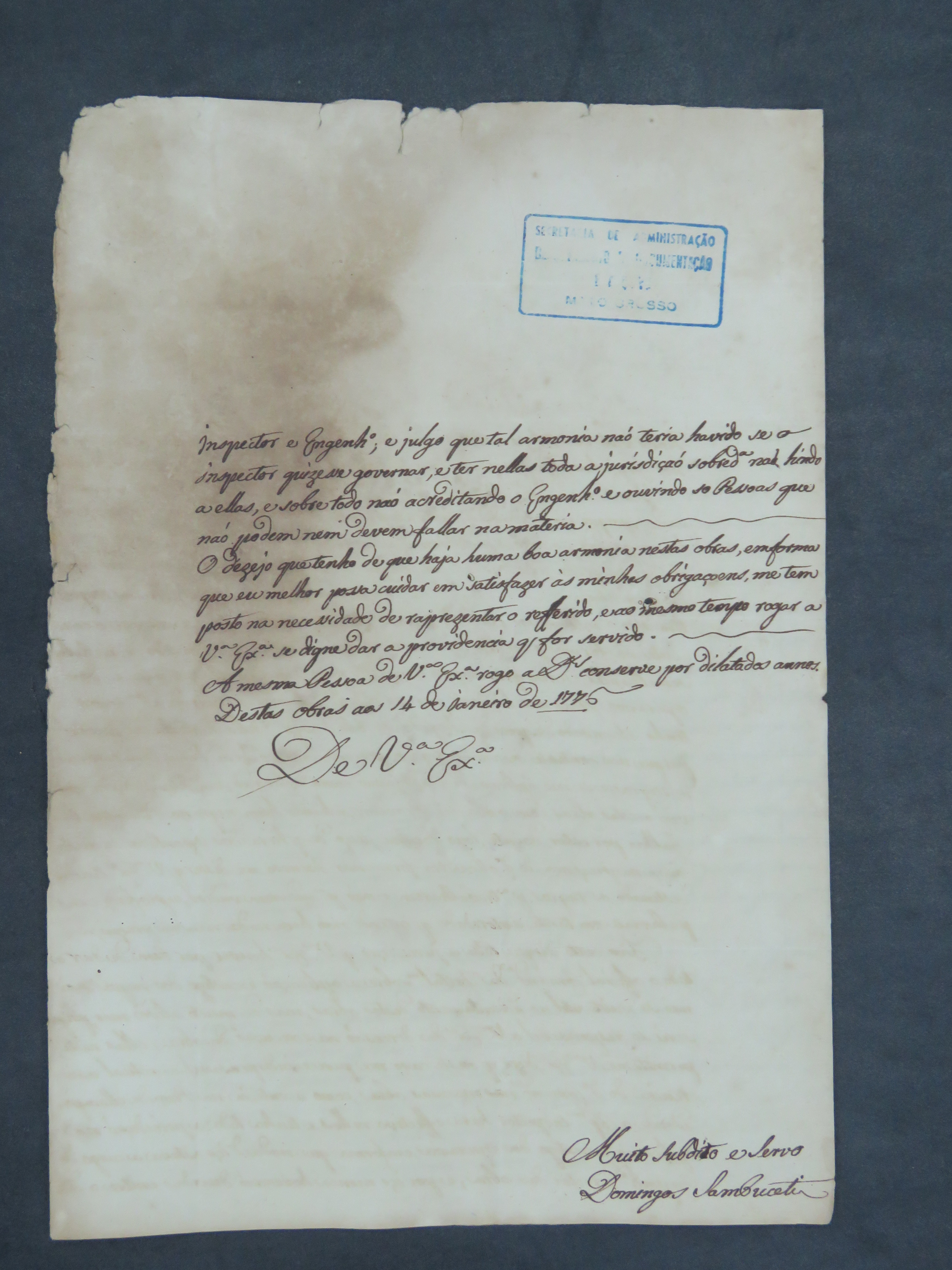 CARTA do Engenheiro Domingos Sambuceti ao [Governador e Capitão General da Capitania de Mato Grosso Luís de Albuquerque de Melo Pereira e Cáceres].