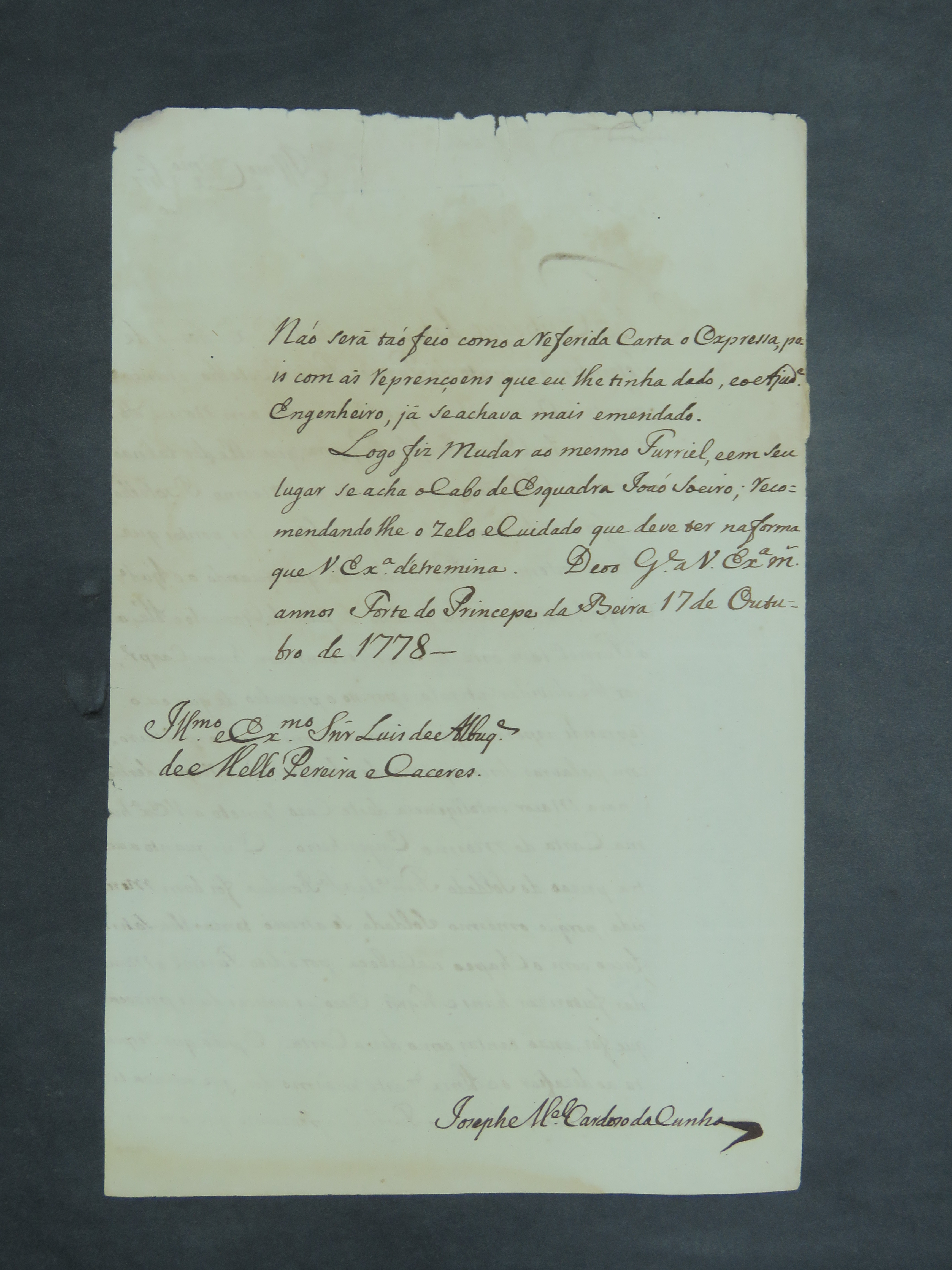 CARTA do Tenente de Dragões Joseph Manoel Cardoso da Cunha ao Governador e Capitão General da Capitania de Mato Grosso Luís de Albuquerque de Melo Pereira e Cáceres.