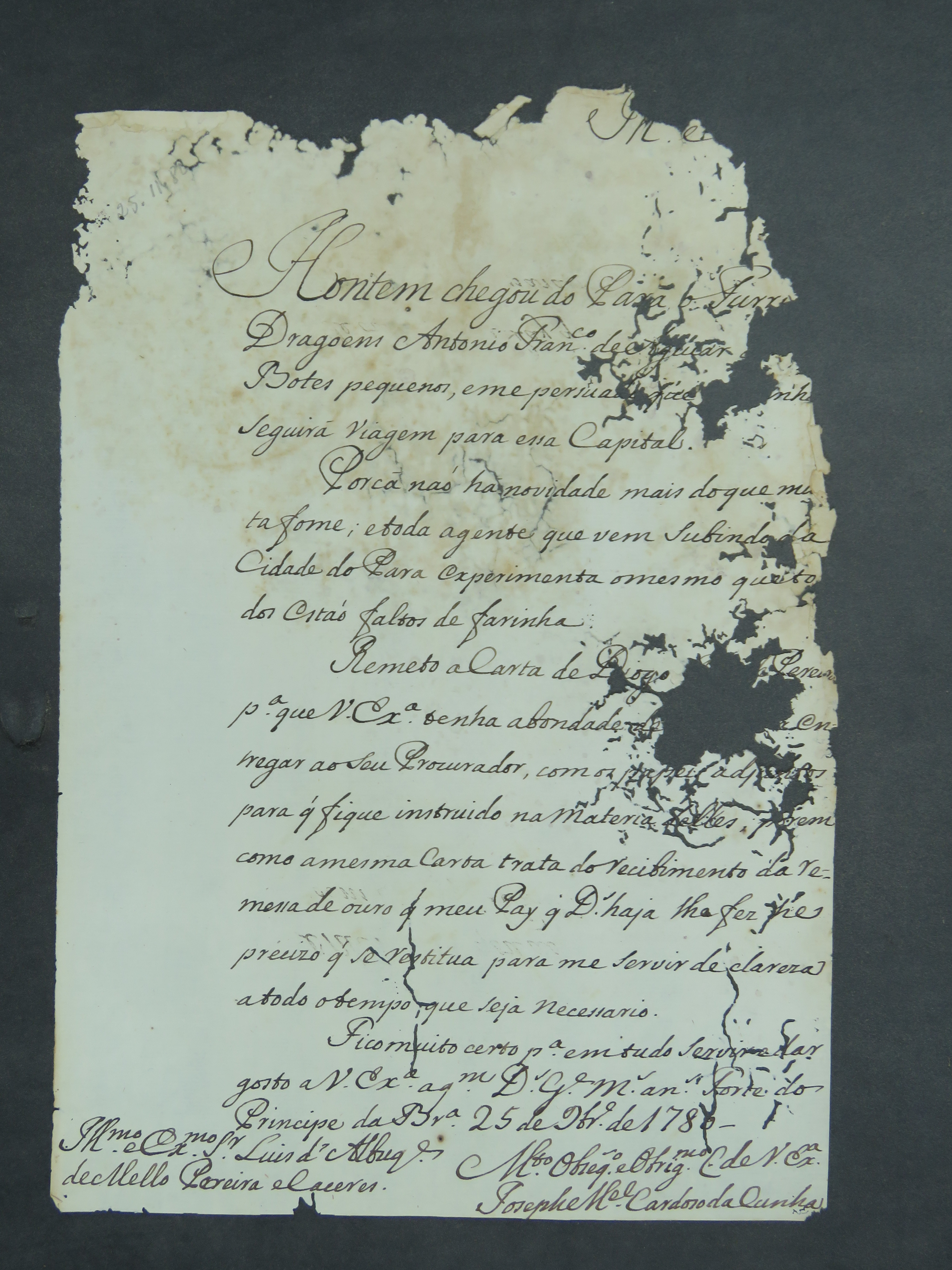 CARTA do [Tenente de Dragões] Joseph Manoel Cardoso da Cunha ao Governador e Capitão-General da Capitania de Mato Grosso Luís de Albuquerque de Mello Pereira e Cáceres.