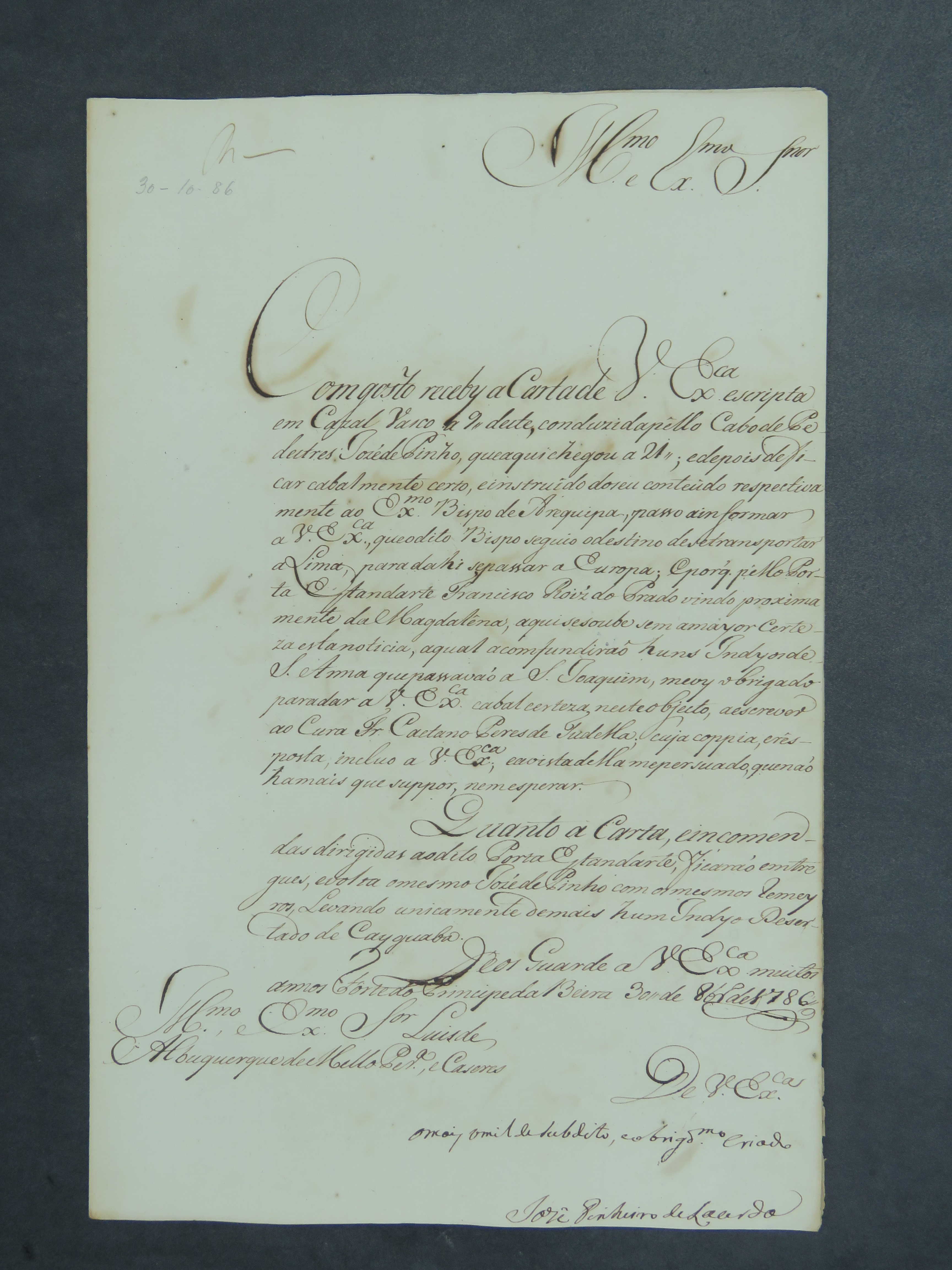 CARTA do [Capitão Engenheiro] José Pinheiro de Lacerda ao Governador e Capitão General da Capitania de Mato Grosso Luís de Albuquerque de Melo Pereira e Cáceres.