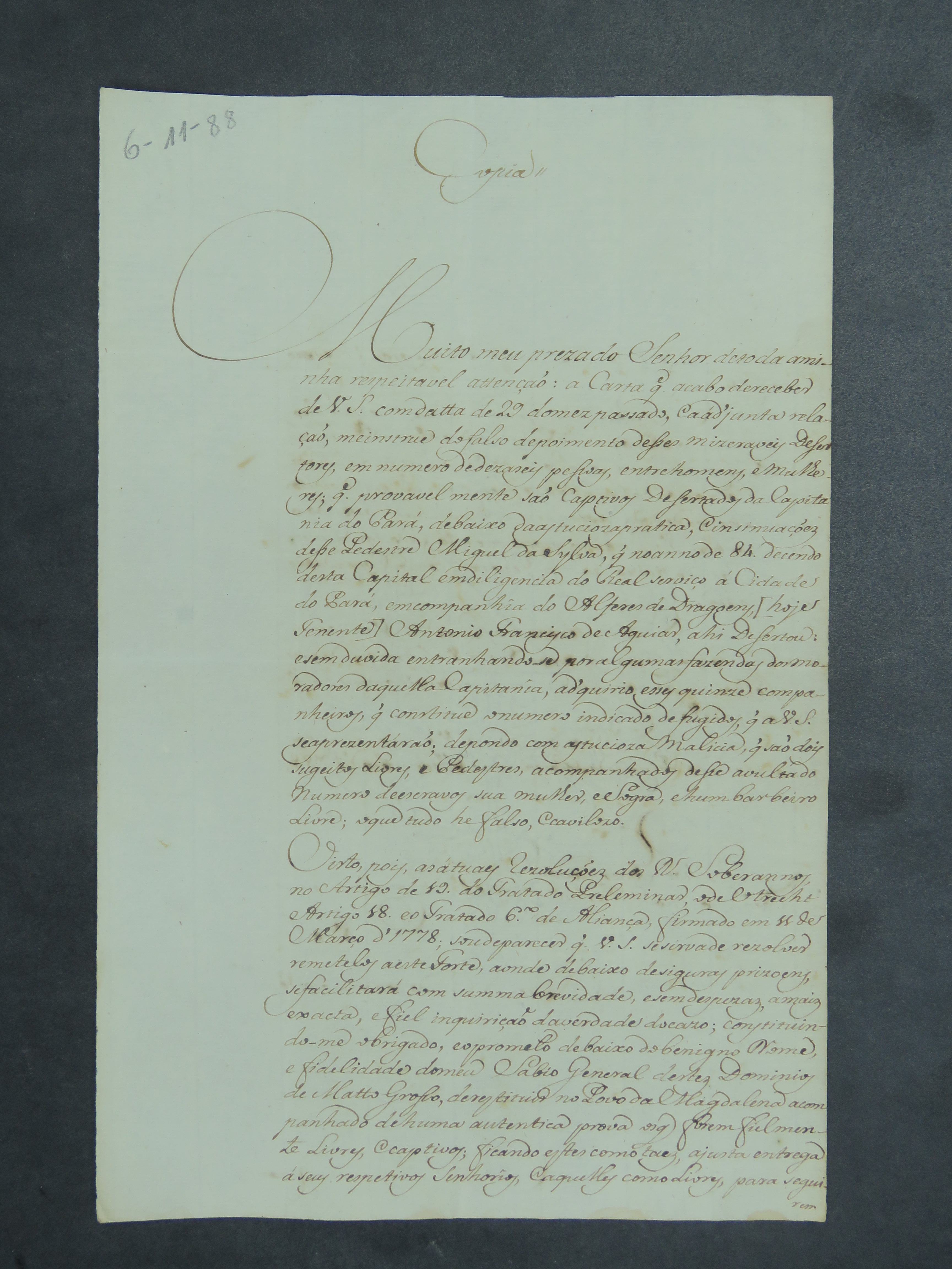 CARTA do Capitão Engenheiro e Comandante José Pinheiro de Lacerda ao Governador da Província de Mochos João Dionísio Marin.