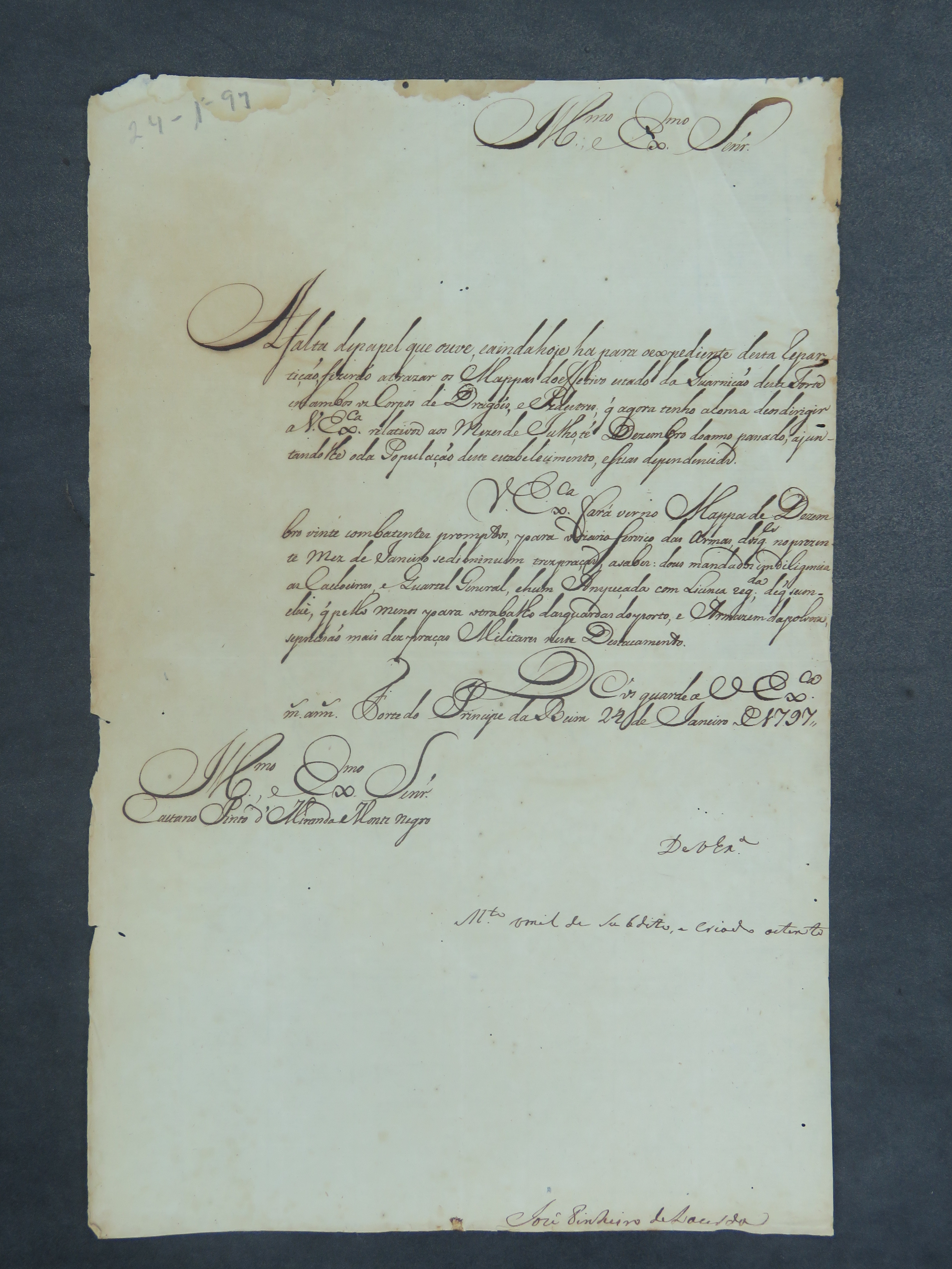 CARTA do [Capitão Engenheiro Comandante] José Pinheiro de Lacerda ao Governador e Capitão-General da Capitania de Mato Grosso Caetano Pinto de Miranda e Montenegro.