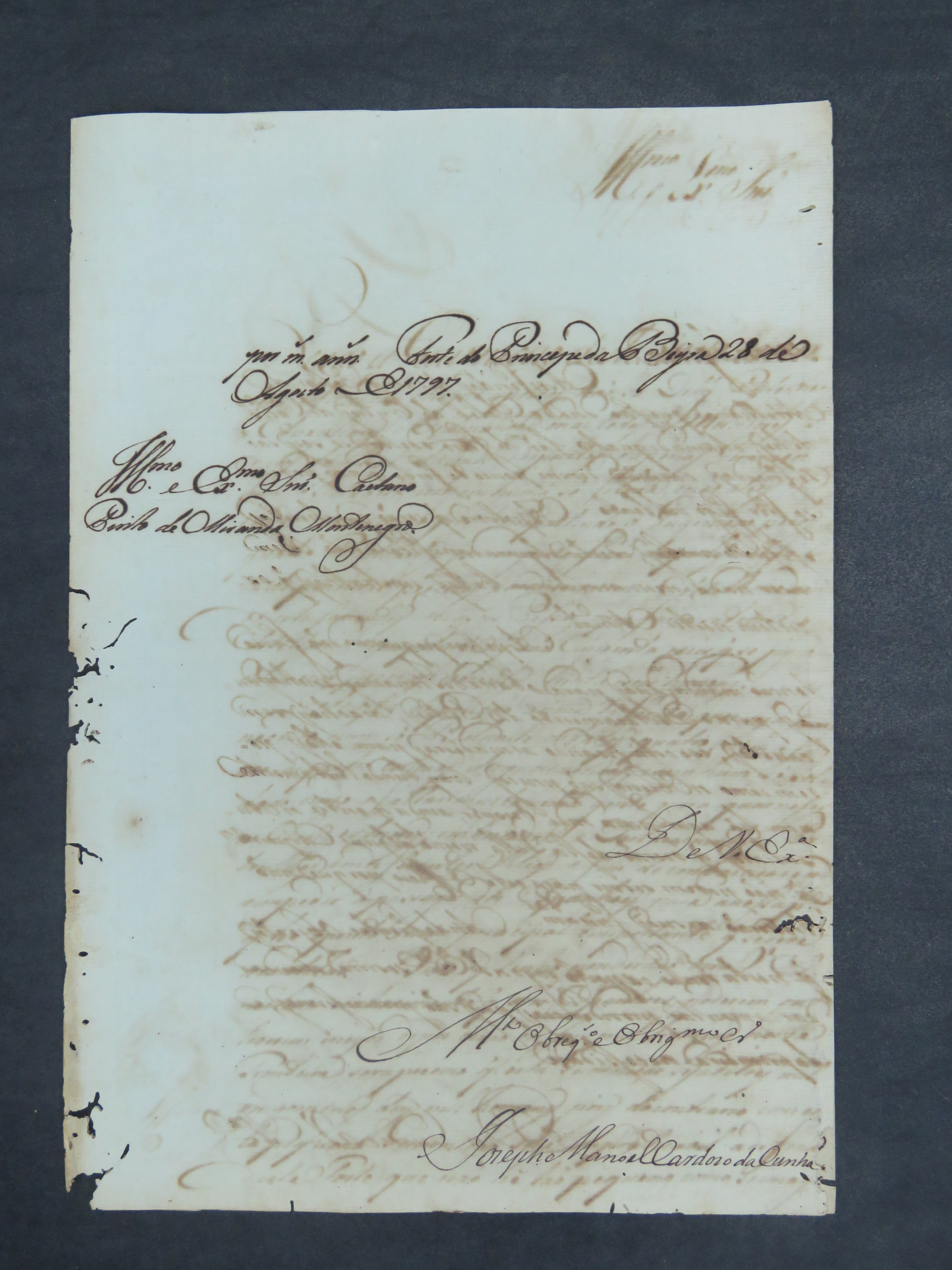 CARTA do [Comandante do Forte Príncipe da Beira] Joseph Manoel Cardoso da Cunha ao Governador e Capitão-General da Capitania de Mato Grosso Caetano Pinto de Miranda e Montenegro.