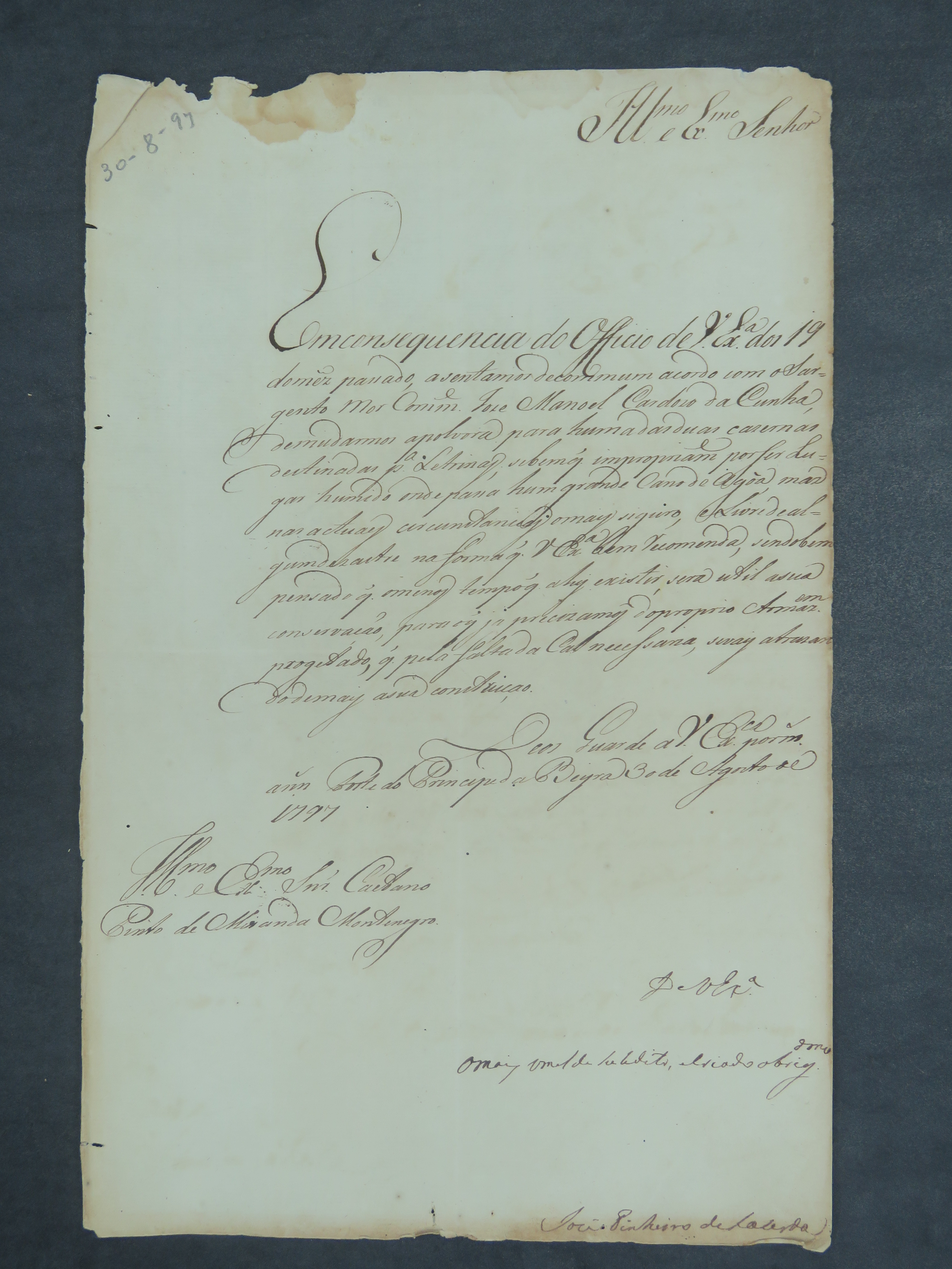 CARTA do [Capitão Engenheiro e Comandante] José Pinheiro de Lacerda ao Governador e Capitão-General da Capitania de Mato Grosso Caetano Pinto de Miranda e Montenegro.