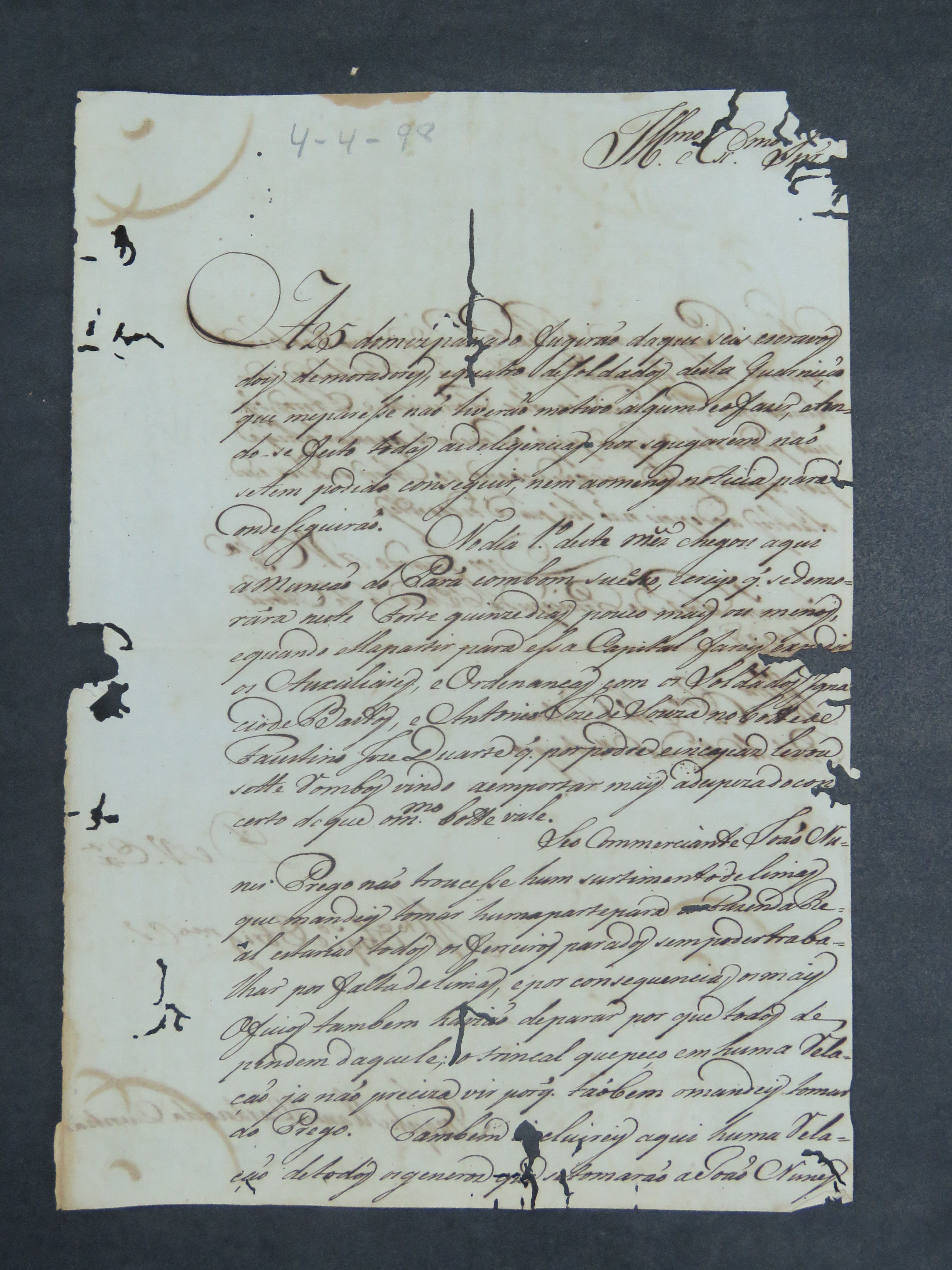 CARTA do [Comandante do Forte Príncipe da Beira] Joseph Manoel Cardoso da Cunha ao Governador e Capitão-General da Capitania de Mato Grosso Caetano Pinto de Miranda e Montenegro.