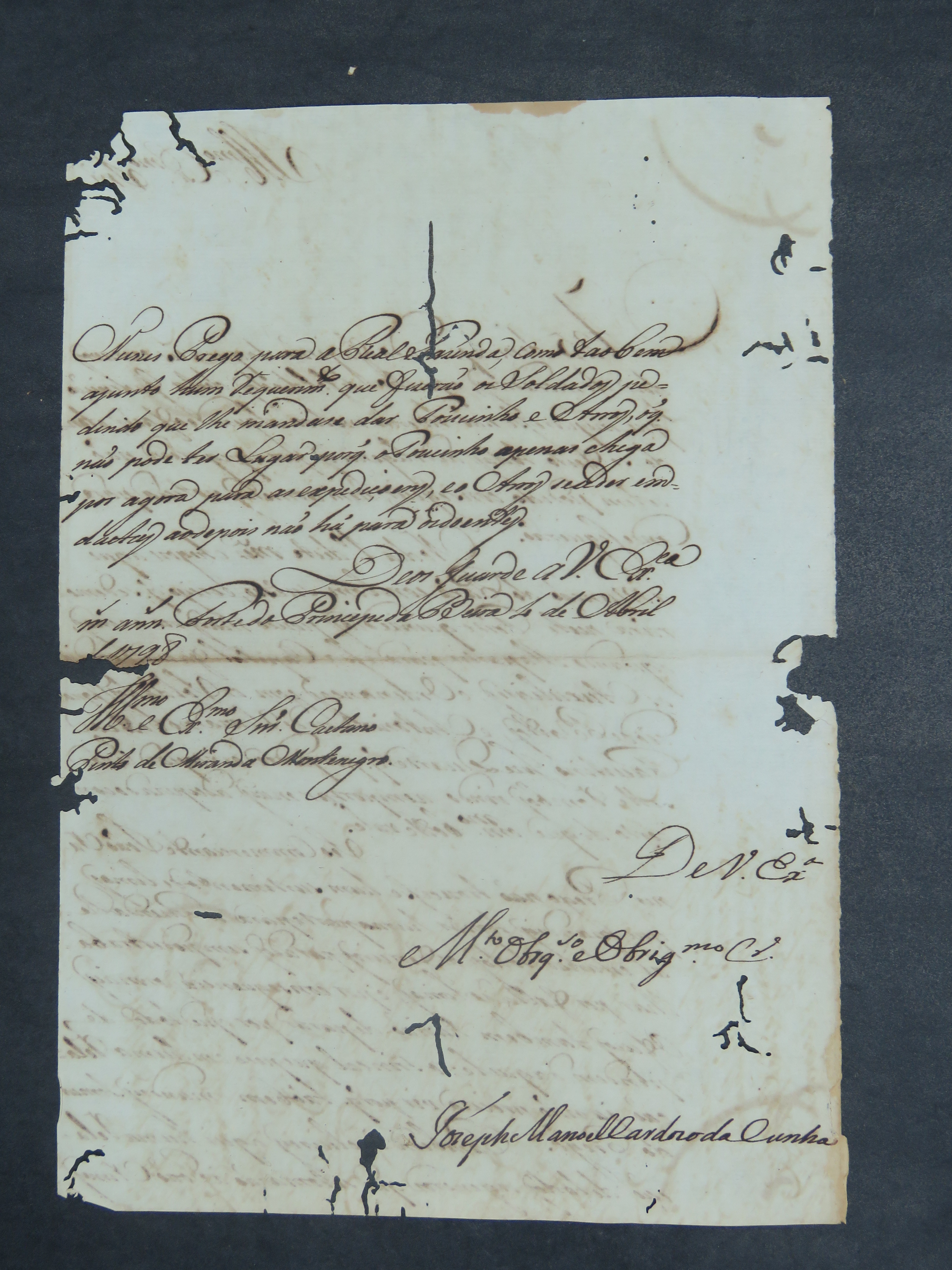 CARTA do [Comandante do Forte Príncipe da Beira] Joseph Manoel Cardoso da Cunha ao Governador e Capitão-General da Capitania de Mato Grosso Caetano Pinto de Miranda e Montenegro.