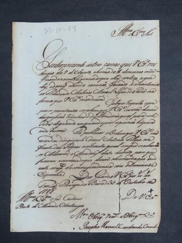 CARTA do [Comandante do Forte Príncipe da Beira] Joseph Manoel Cardoso da Cunha ao Governador e Capitão-General da Capitania de Mato Grosso Caetano Pinto de Miranda e Montenegro.