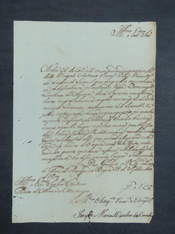 CARTA do [Comandante do Forte Príncipe da Beira] Joseph Manoel Cardoso da Cunha ao Governador e Capitão-General da Capitania de Mato Grosso Caetano Pinto de Miranda e Montenegro.