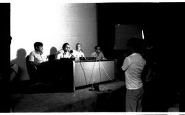 Entrevista coletiva concedida pelo candidato vencedor ao governo de Mato Grosso Júlio José de Campos, acompanhado pelo vice-governador eleito Wilmar Peres de Farias, pelo então governador Frederico Carlos Soares de Campos e pelo presidente regional do Partido Democrático Social (PDS) José Monteiro de Figueiredo. Fotógrafo Lenine Martins.