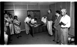 Assinatura de convênio entre a Procuradoria Geral de Justiça, na pessoa de seu procurador-geral Luiz Vidal da Fonseca, e secretário-geral do Departamento de Viação e Obras Públicas (DVOP) Osvaldo José da Costa, visando a construção da nova sede e inauguração de sistema informatizado. Fotógrafo Mário Vilela.