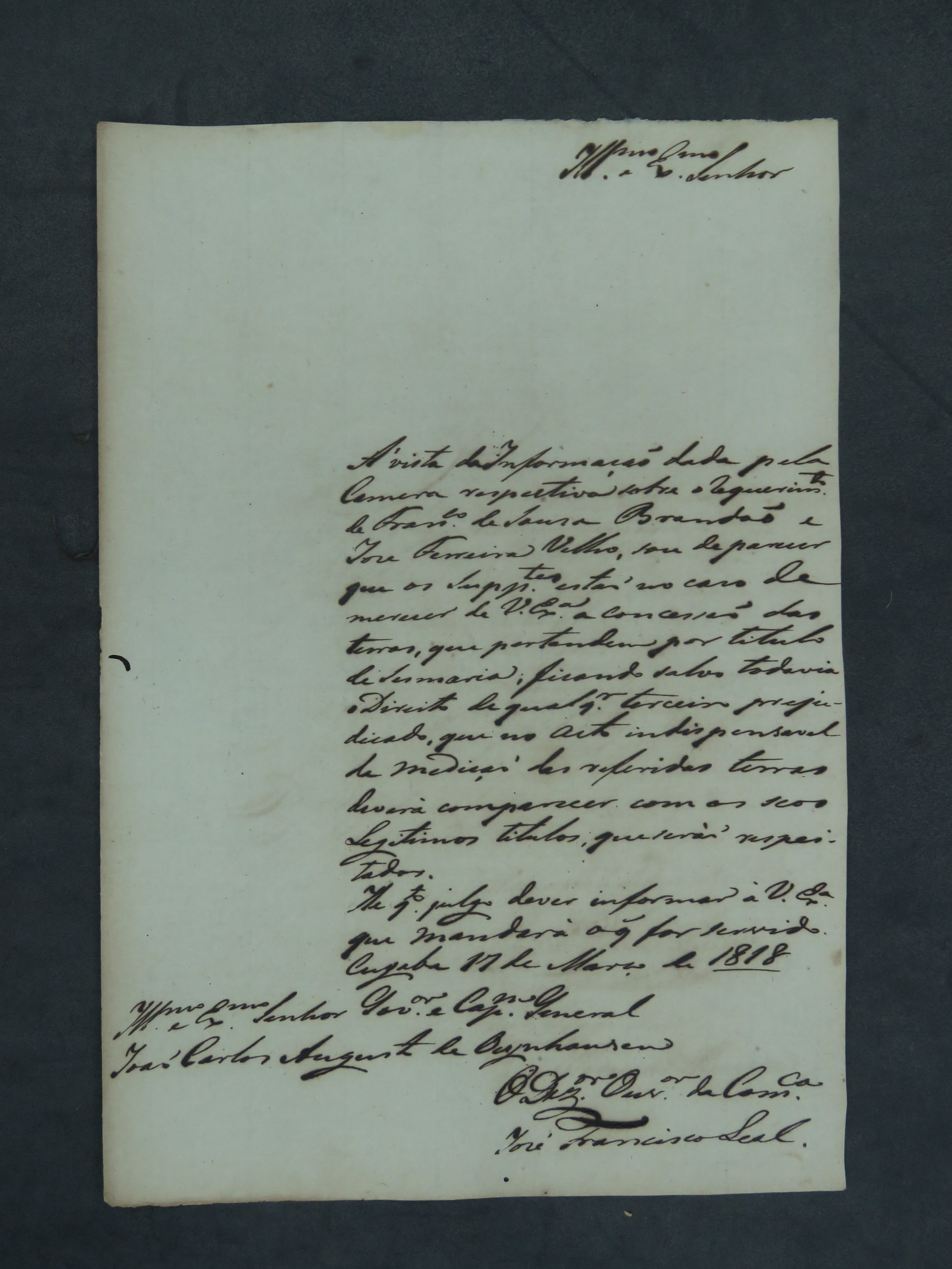 REQUERIMENTO de Francisco de Sousa Brandão e José Ferreira Velho ao Governador e Capitão-General da Capitania de Mato Grosso João Carlos Augusto d´Oeynhausen e Gravemberg.