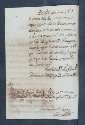 Dossiê / Processo 0482 - CARTA do Governador de Assunção Lázaro Ribera ao Tenente Coronel Comandante do Forte de Coimbra Ricardo Franco de Almeida Serra.