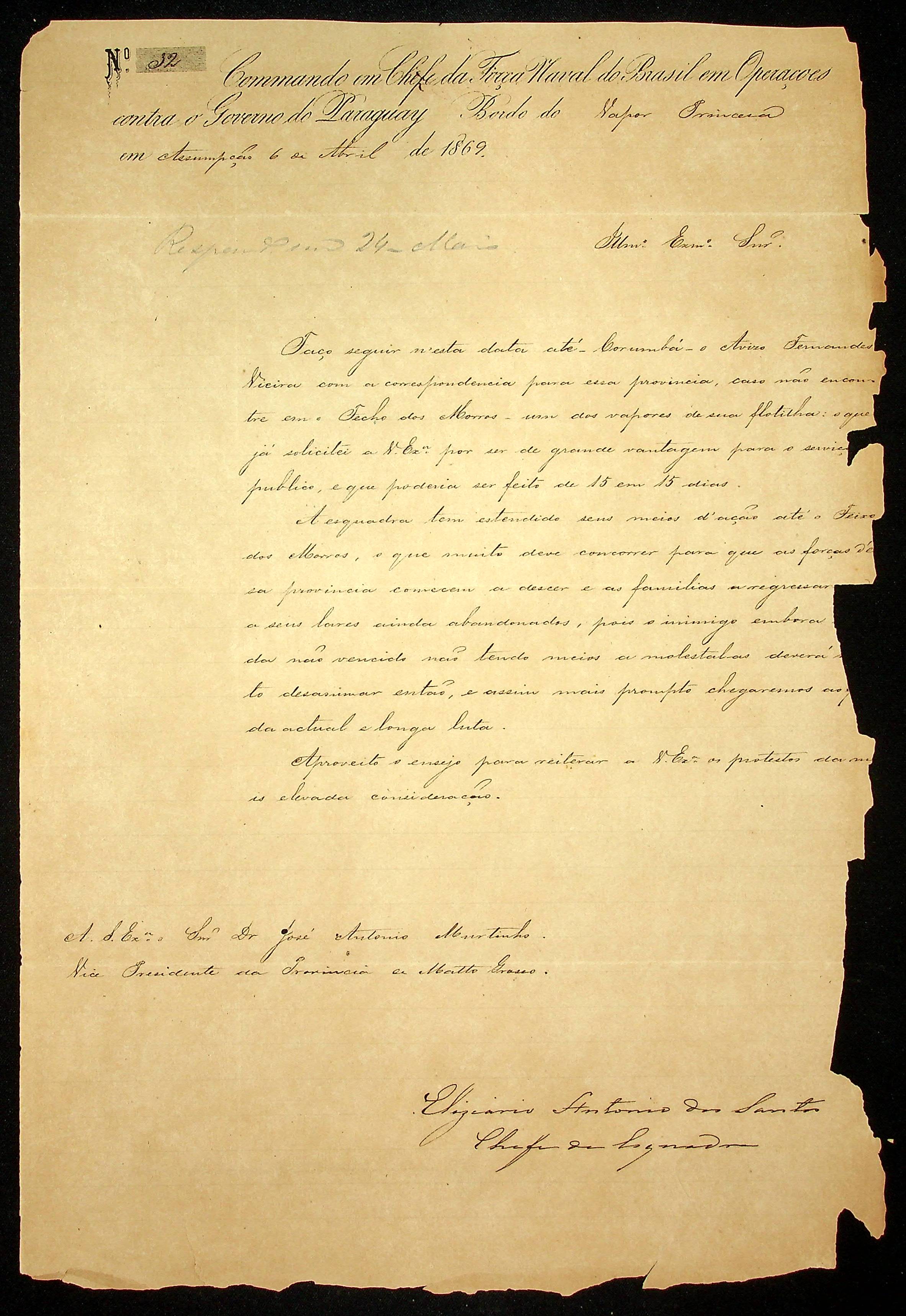 OFÍCIO do Chefe de Esquadra Eliziario Antonio dos Santos ao Vice-Presidente da Província de Mato Grosso, Dr. José Antonio Murtinho.