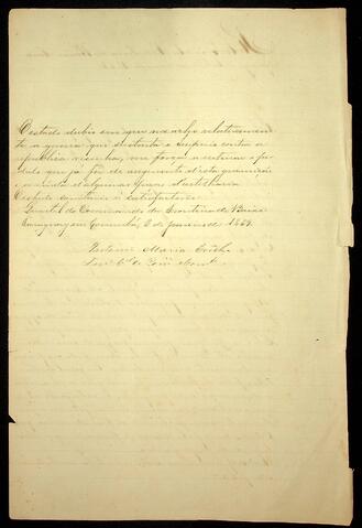 RELATÓRIO da Fronteira do Baixo Paraguay relativo ao ano de1868 assinado Tenente Coronel de [Comissão] Comandante Antonio Maria Coêlho.